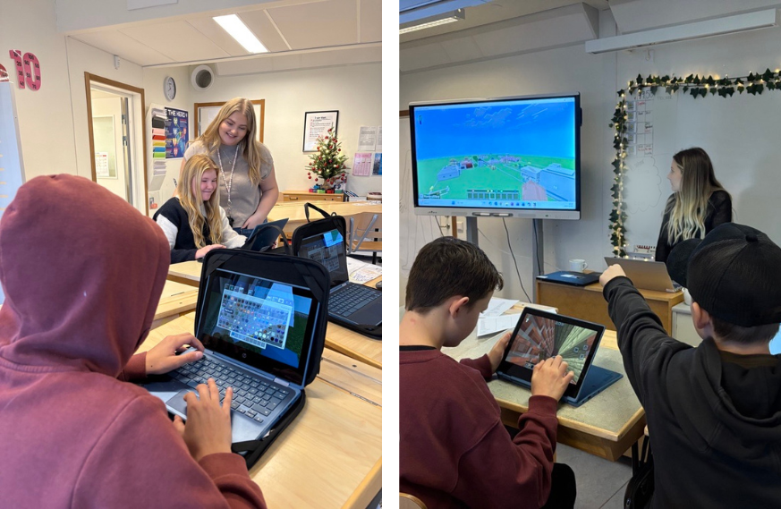 När vi besökte klass 5A och 5B på Fridhemskolan i Vårgårda var engagemanget påtagligt. Eleverna satte igång direkt och presenterade stolt sina områden. De flesta hade spelat Minecraft sedan de var små – och nu fick de plötsligt använda sitt favoritspel som ett verktyg i lärandet.