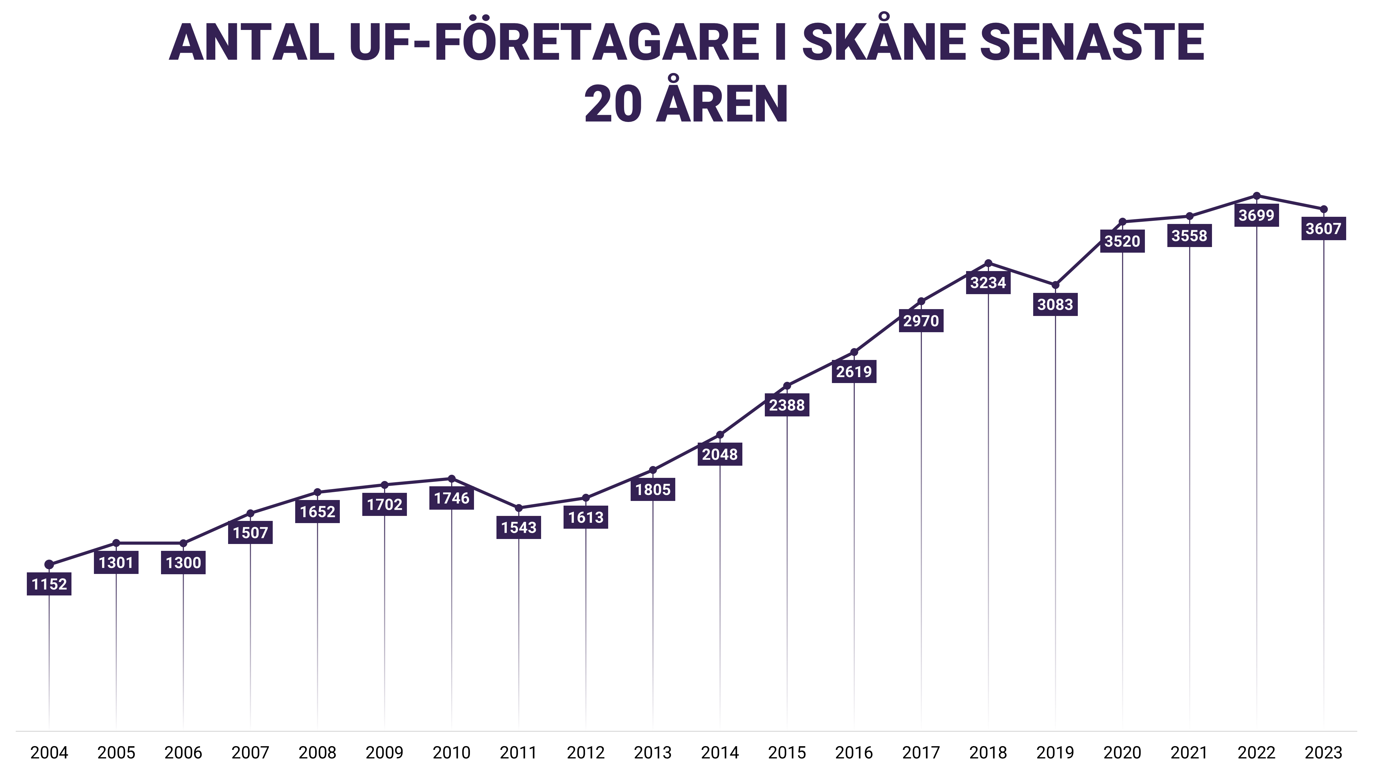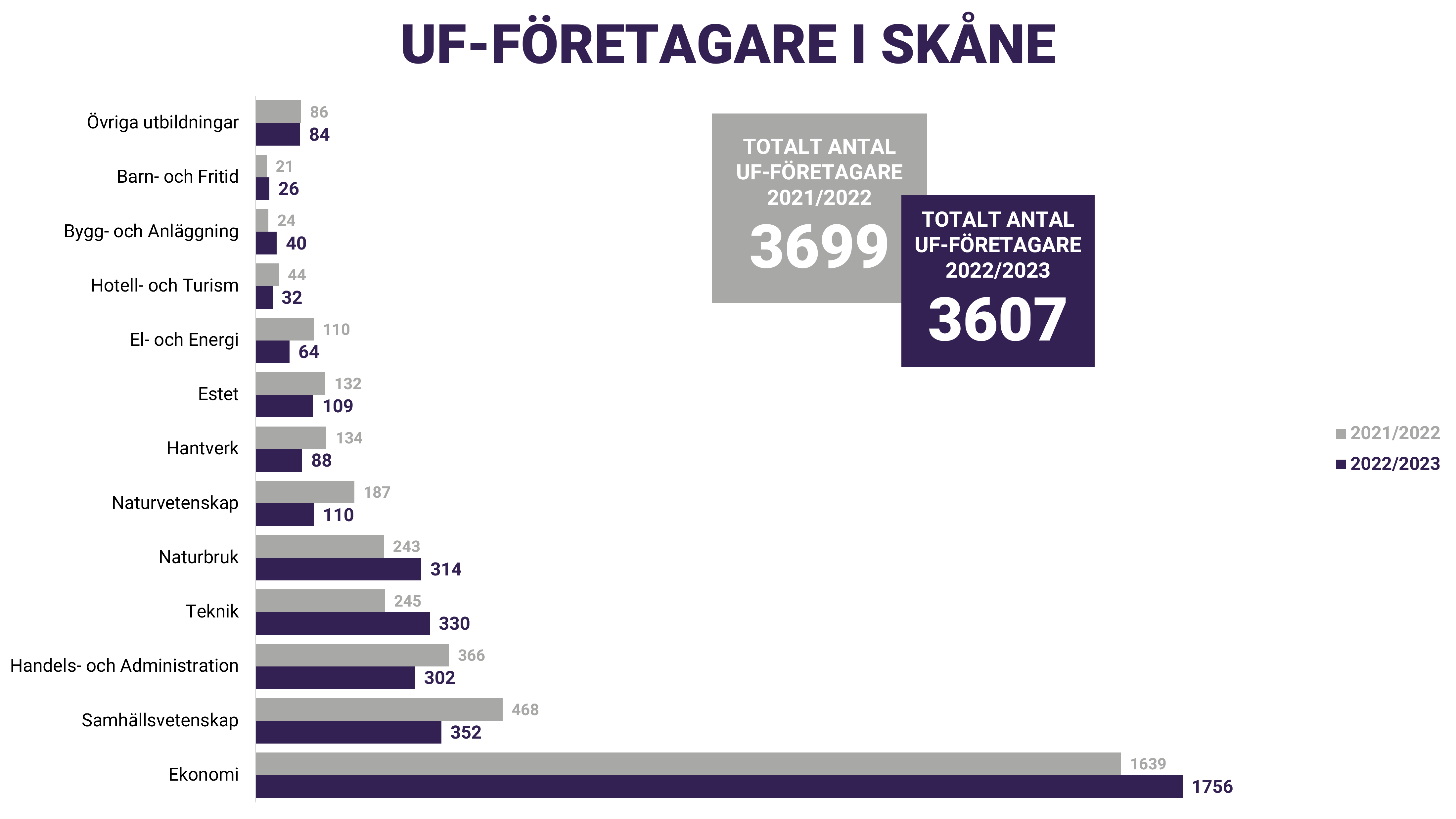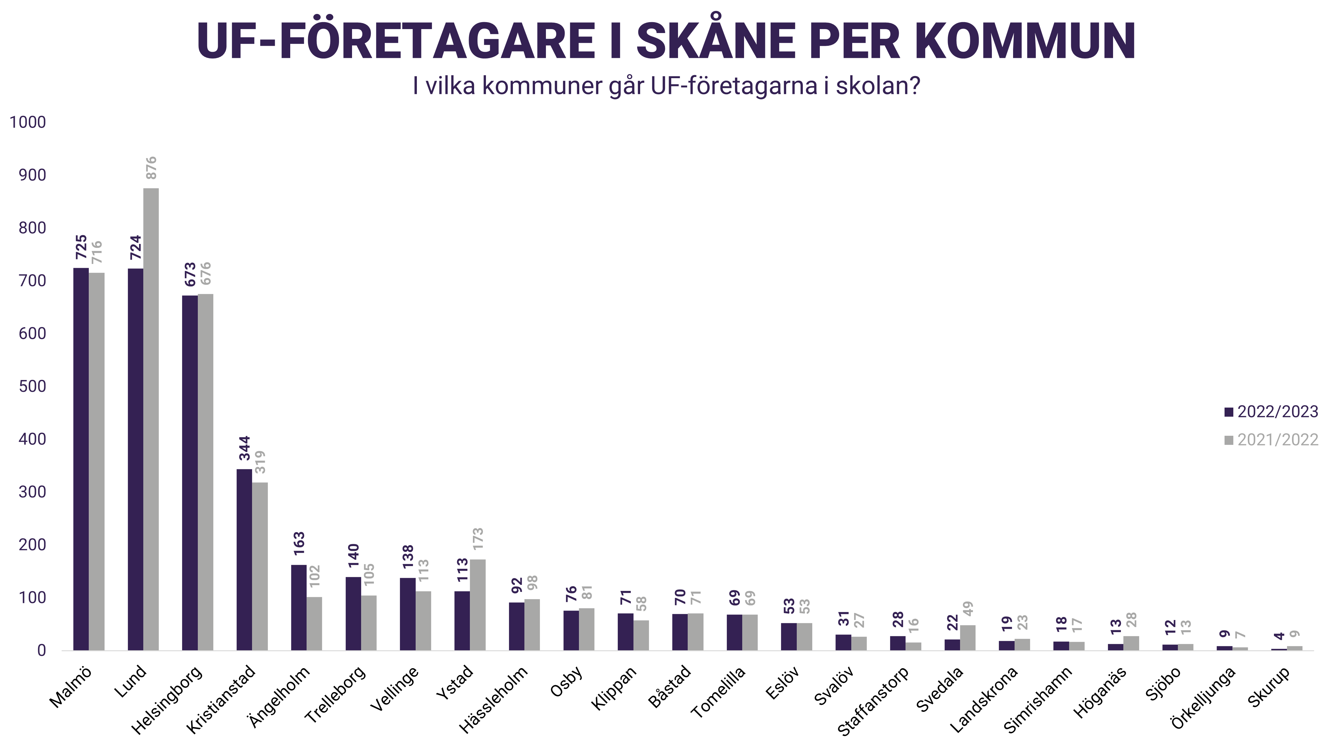För första gången på tre år så minskade antalet UF-företagare i Skåne. Till stor del beror det på att stora skolkoncerner valt att flytta UF-kursen från årskurs 2 till årskurs 3 och därmed kan vi återigen räkna med dessa skolor 2023/2024. Trots en viss minskning så kan vi fortsatt konstatera att över 3600 gymnasieelever i Skåne får testa på att starta, driva och avveckla företag under sin skolgång. Vår kommunspecifika statistik visar också var större insatser behövs, kopplat till UF-företagande och entreprenörskap, under kommande läsår.