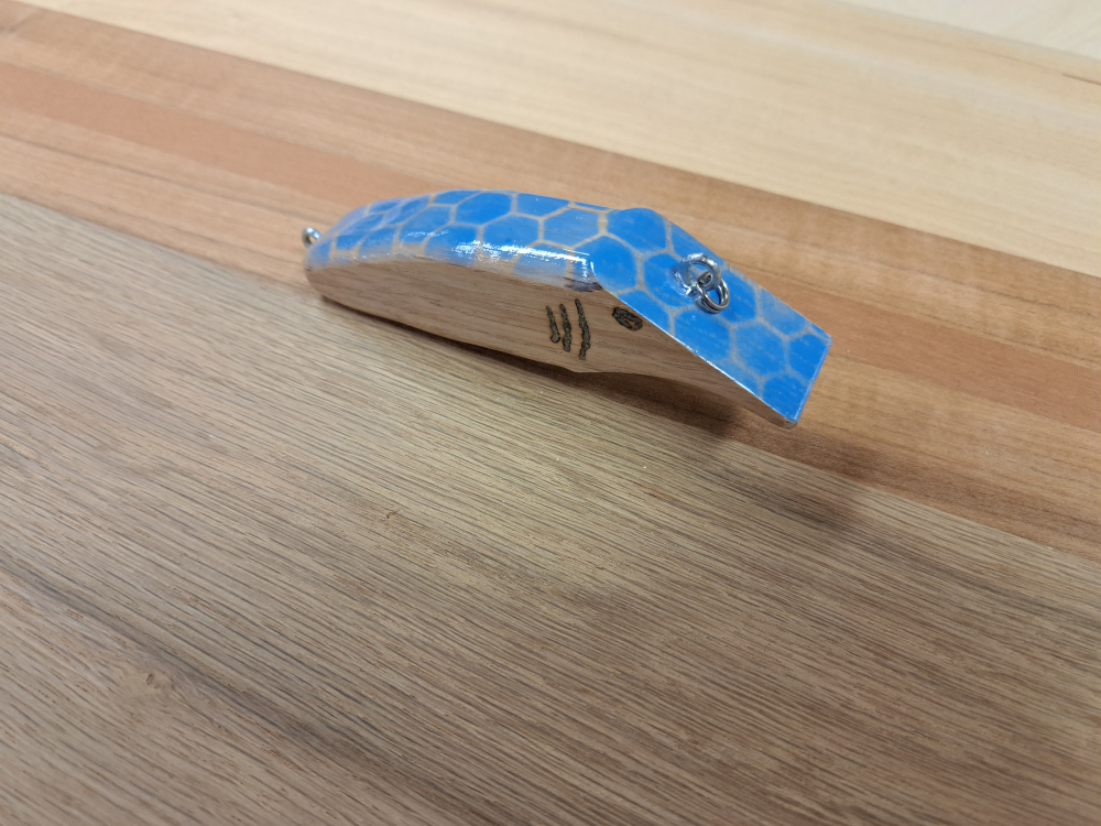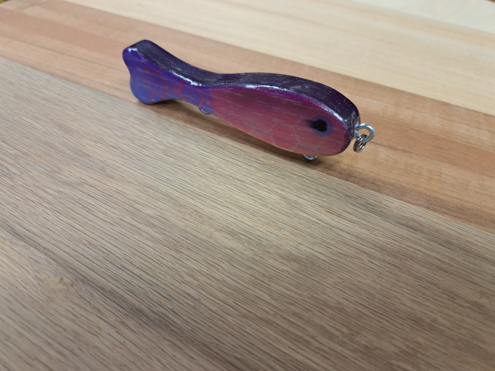Tre olika modeller av fiskedrag som är gjorda i trä.