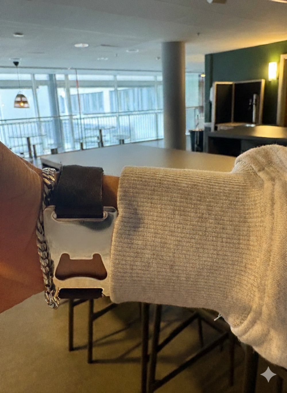 Ett funktionellt armband med läderrem med metallkapsylöppnare.