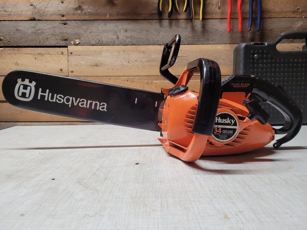 Ett reparationstjänst för 589 kronor. En motorsåg av modell HUSKY 34 DELUXE gå fint igen efter stor underhållsarbete.