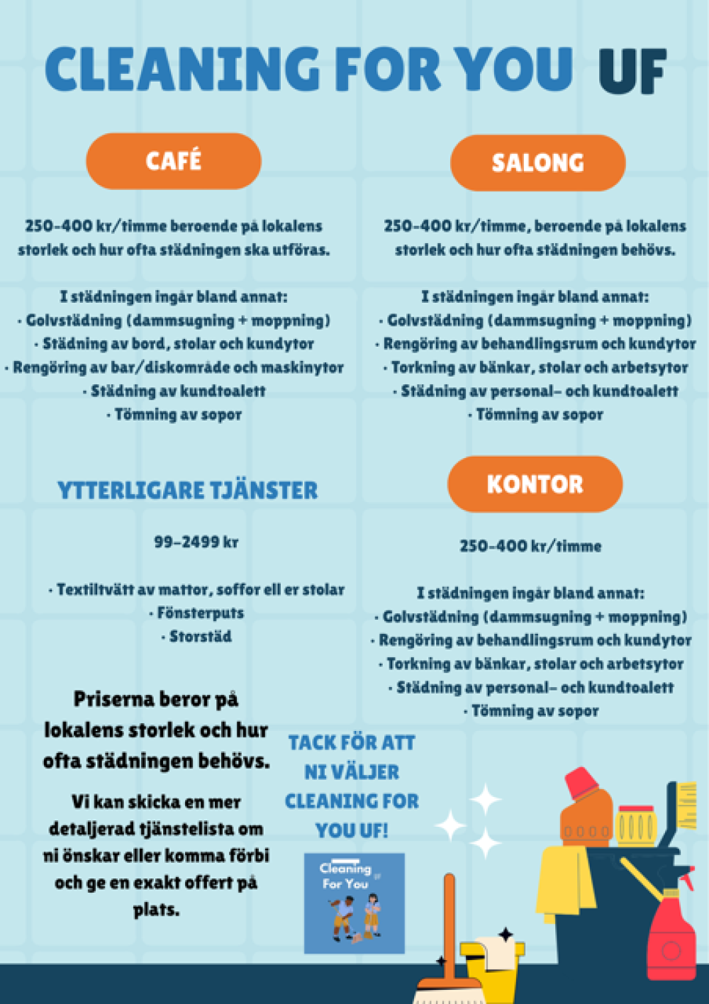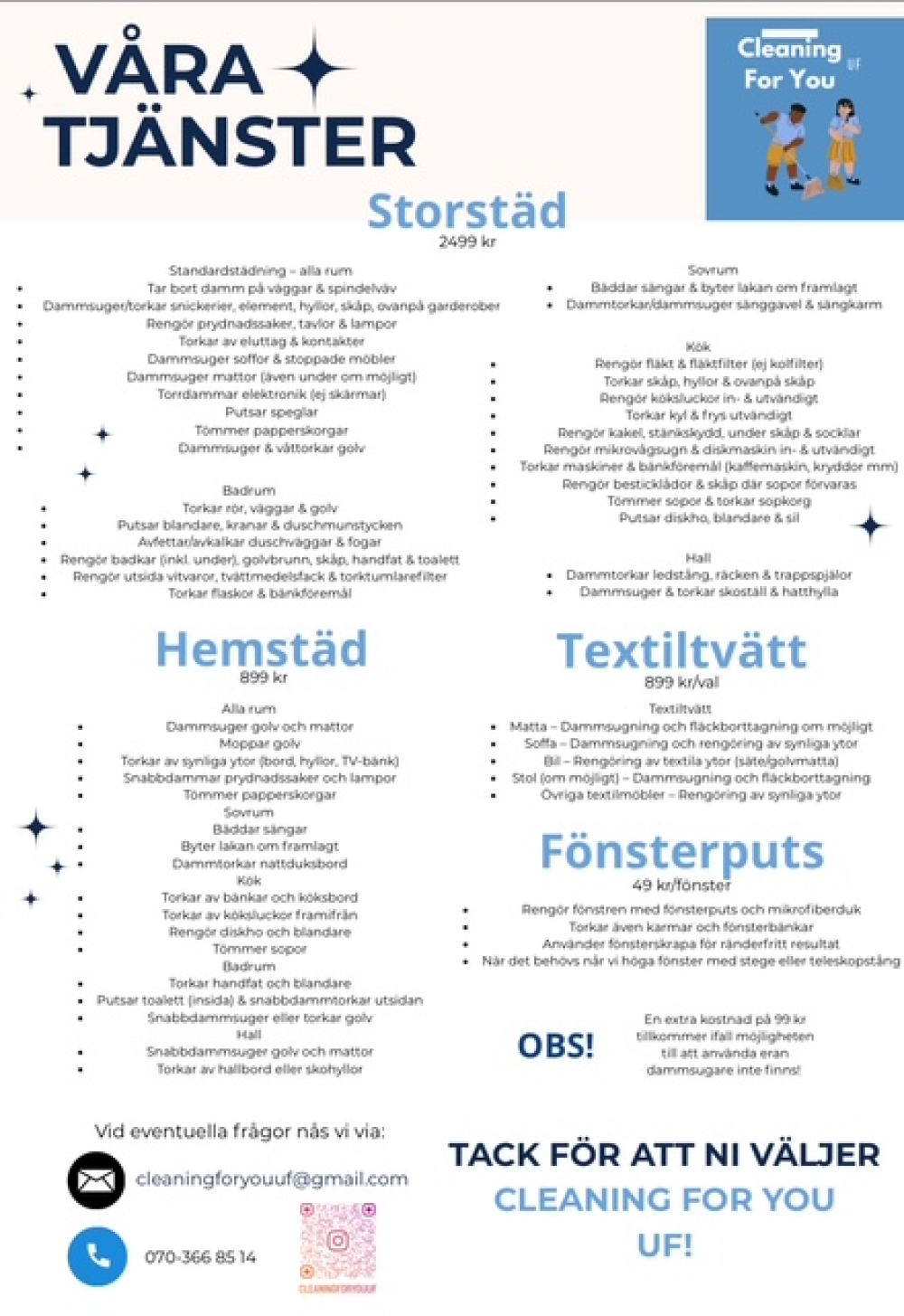 Vi erbjuder olika tjänster inom hemstäd som hjälper alla med bostad att friska upp och återuppliva sitt hem. Allt från vanlig dammsugning och moppning till tvätt av soffor, mattor och mera. Vi är unika eftersom priset på våra tjänster är mycket mer skonsamt för plånboken än priset konkurrenterna erbjuder. Våran målgrupp är alla från 18 år och uppåt som har ett hem och behöver lite hjälp med städningen.