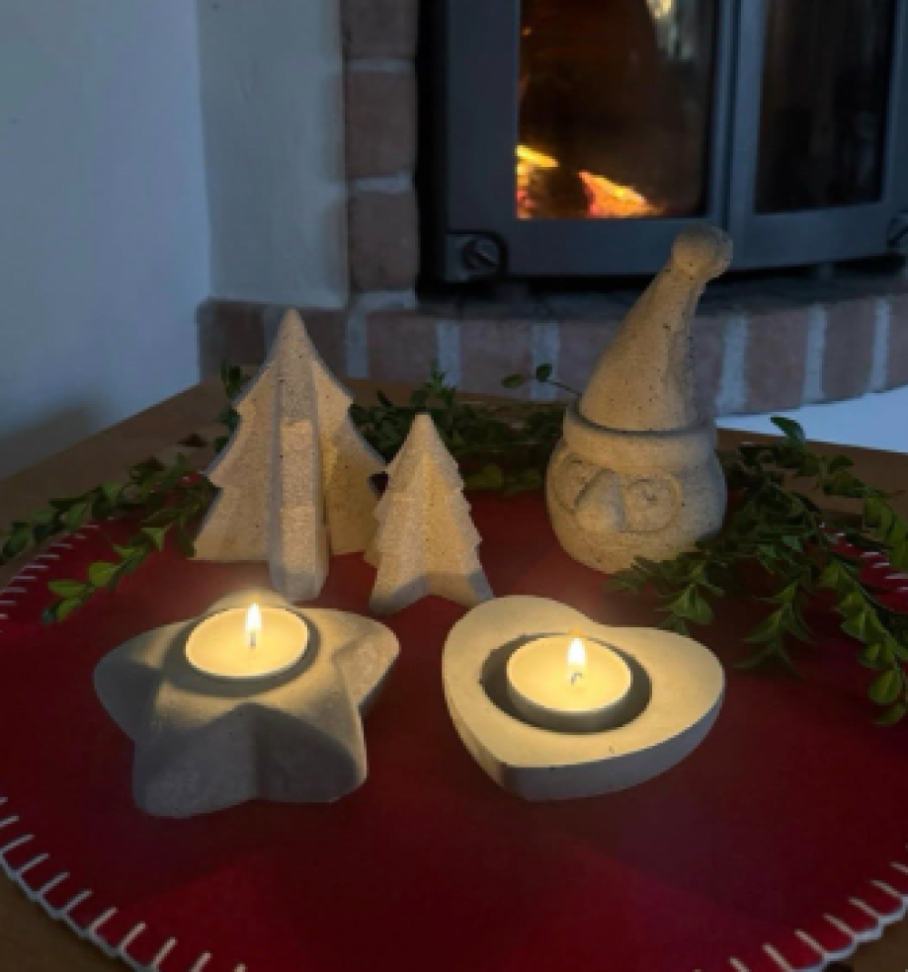 Vi är Concrete UF och vi skapar unika skulpturer och designs i betong, helt efter årstidens tema, i höstas gjorde vi handgjorda pumpor, och till julen skapade vi mysiga, juliga designs i form av tomtar, stjärnor, granar och hjärtan. Vi tänker hållbart, vår betong håller länge och vi använder oss av begagnade produkter till produktionen som annars skulle slängas.