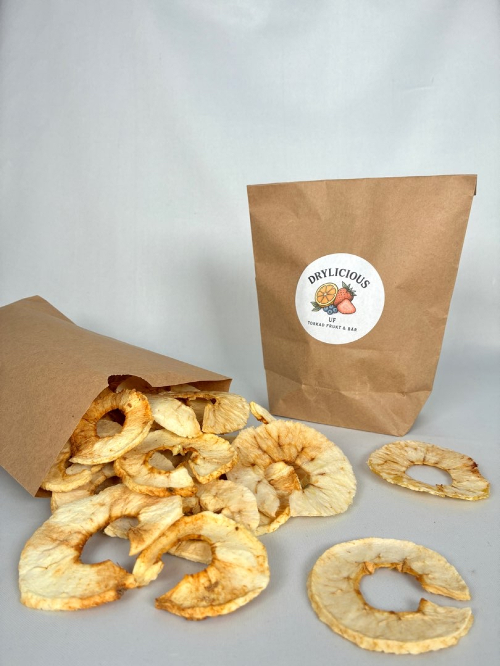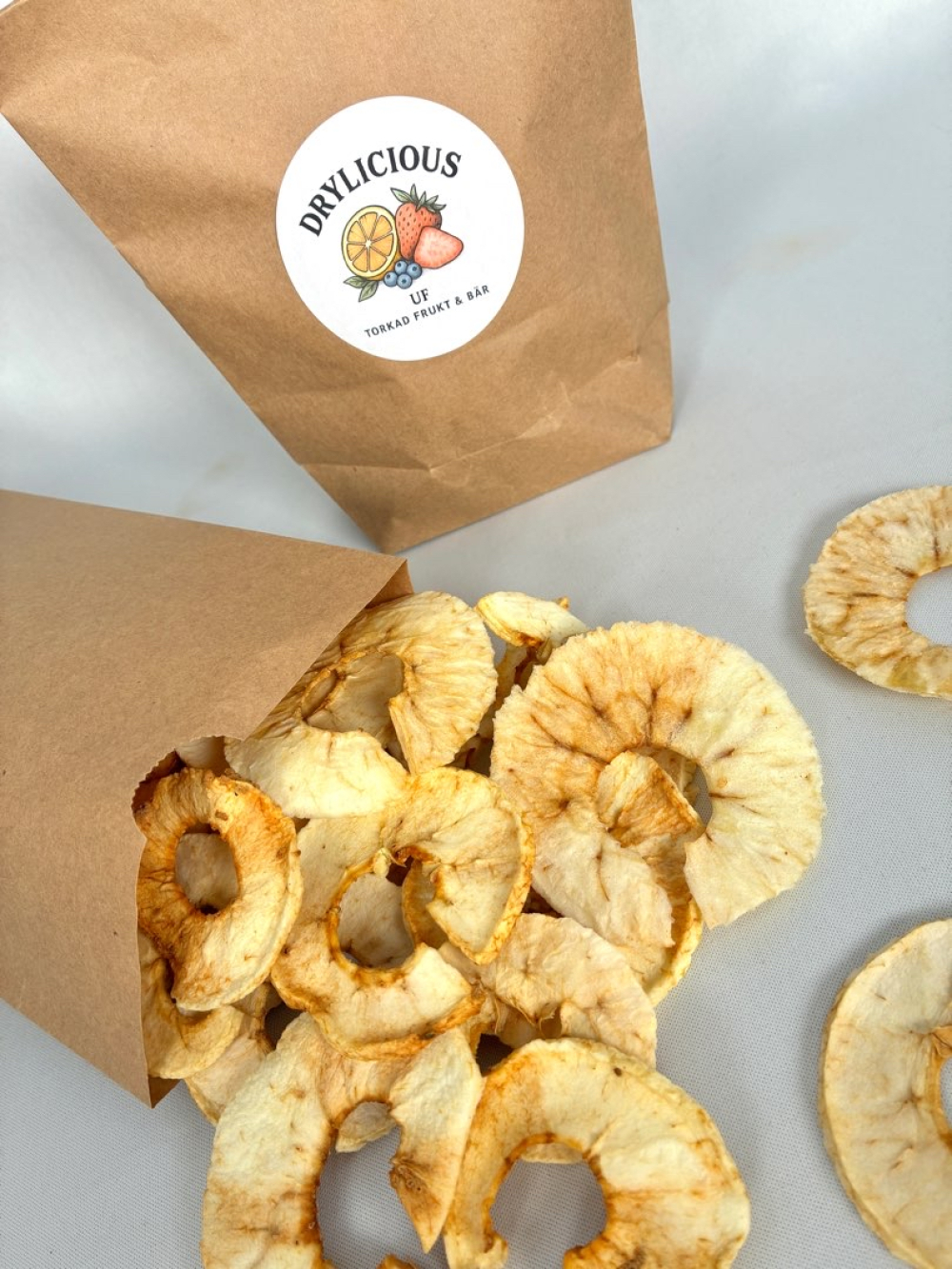 Torkad frukt gjort på frukter som annars skulle slängas. Utan tillsatser.