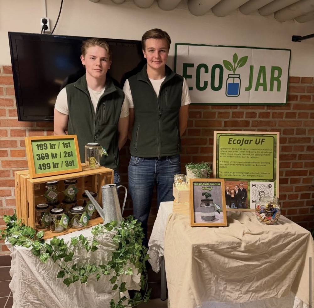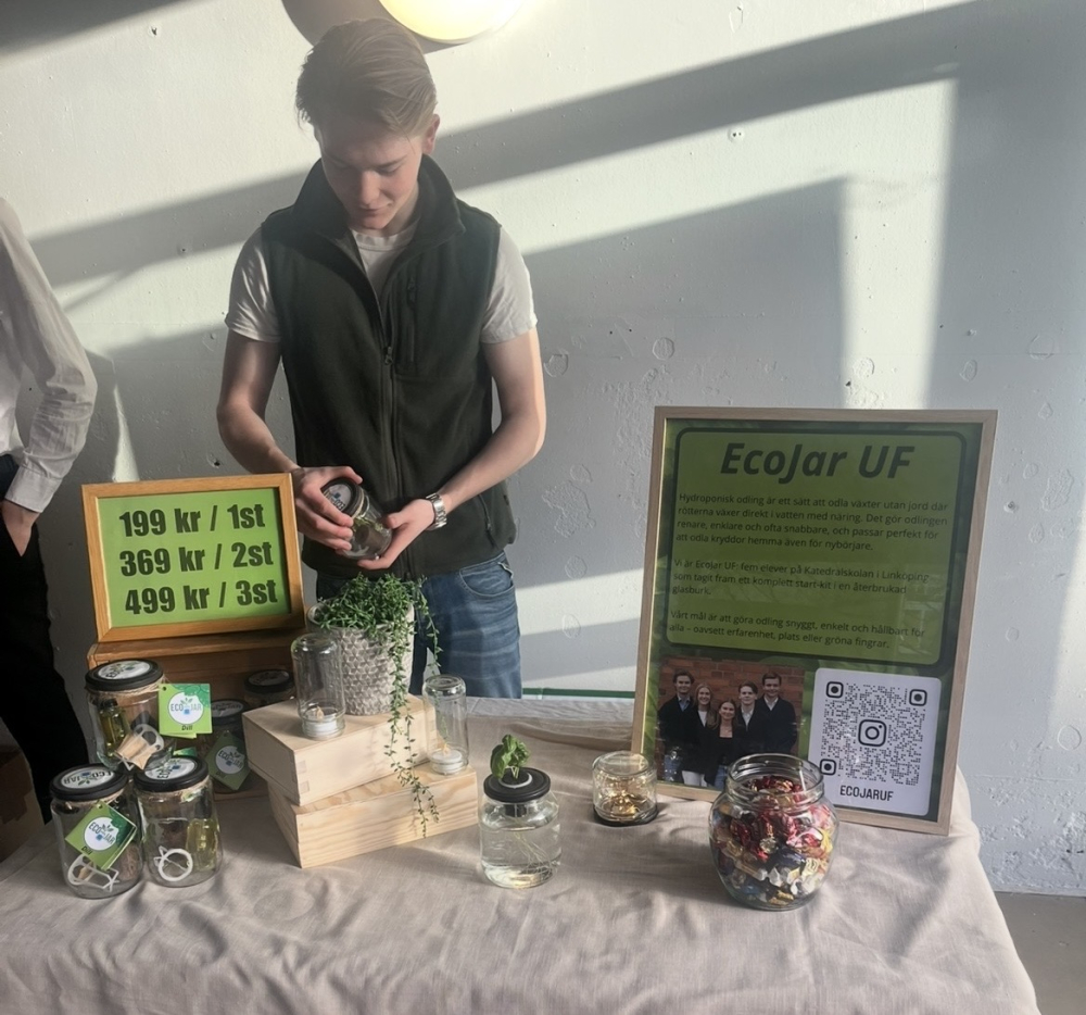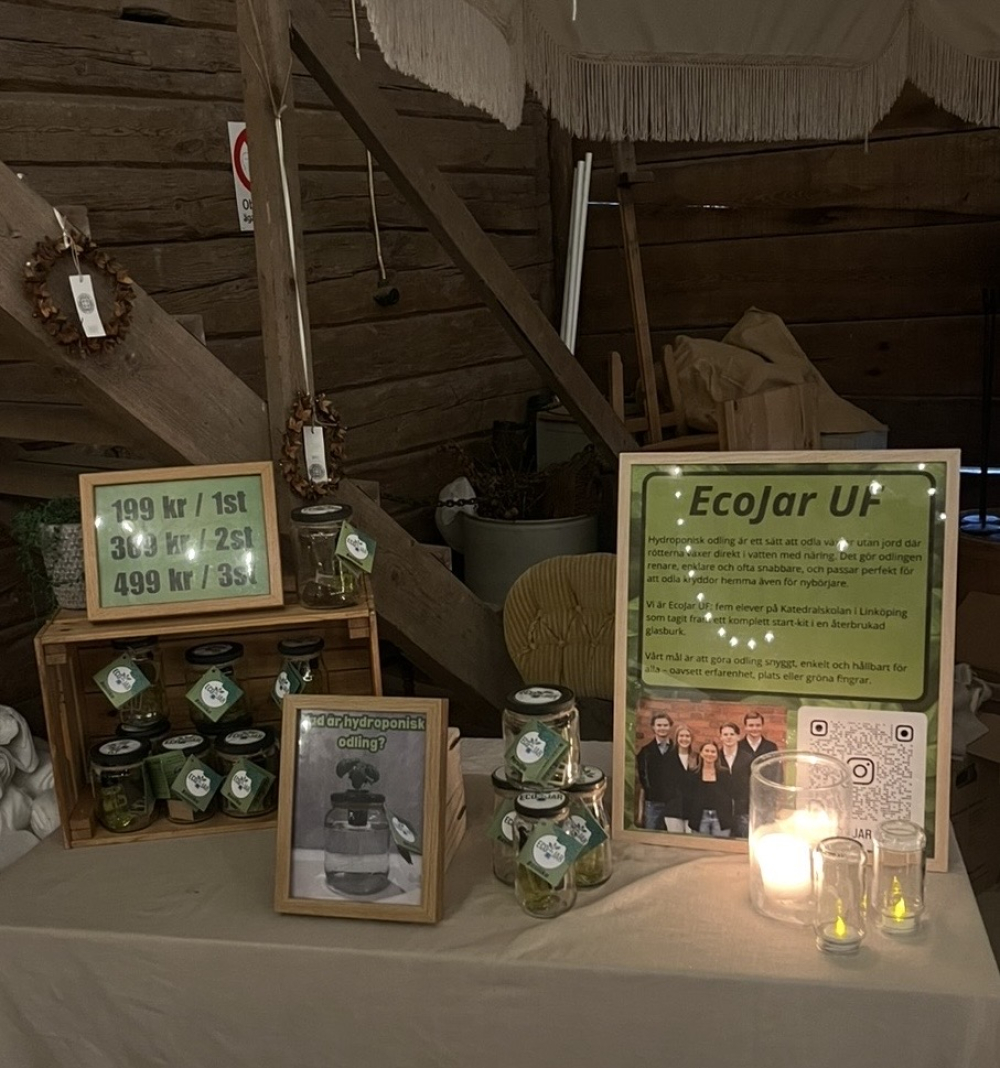 Vi är fem elever på Katedralskolan i Linköping som vill göra hydroponisk odling enkel, snygg och hållbar. Vi såg att många kit på marknaden var komplicerade och svåra att använda. Vårt mål är att alla ska kunna odla sina egna kryddor hemma, oavsett erfarenhet eller utrymme. Genom EcoJar UF vill vi kombinera design, miljötänk och användarvänlighet för att inspirera fler till en grönare vardag.