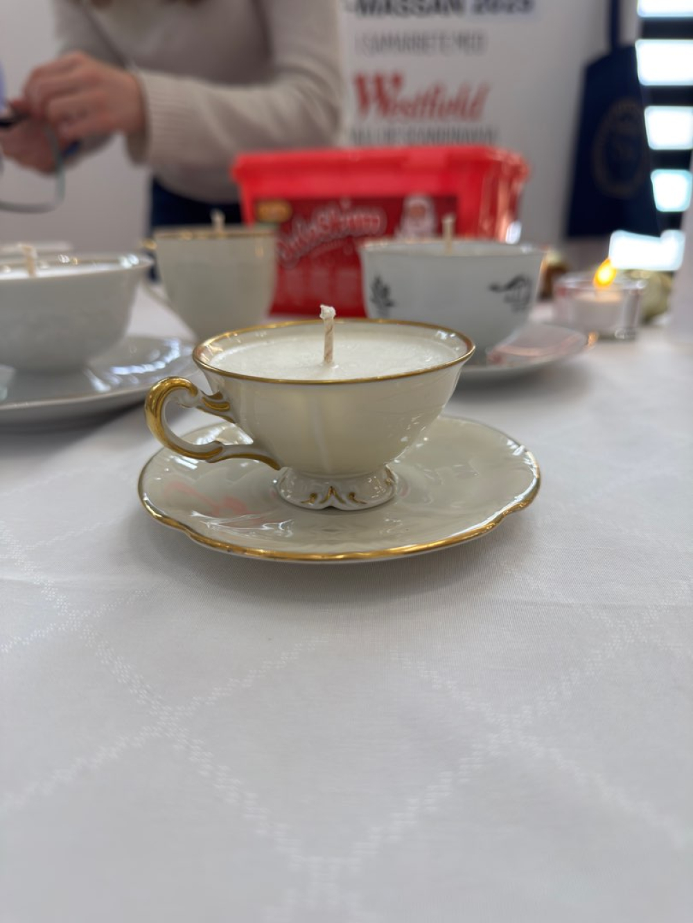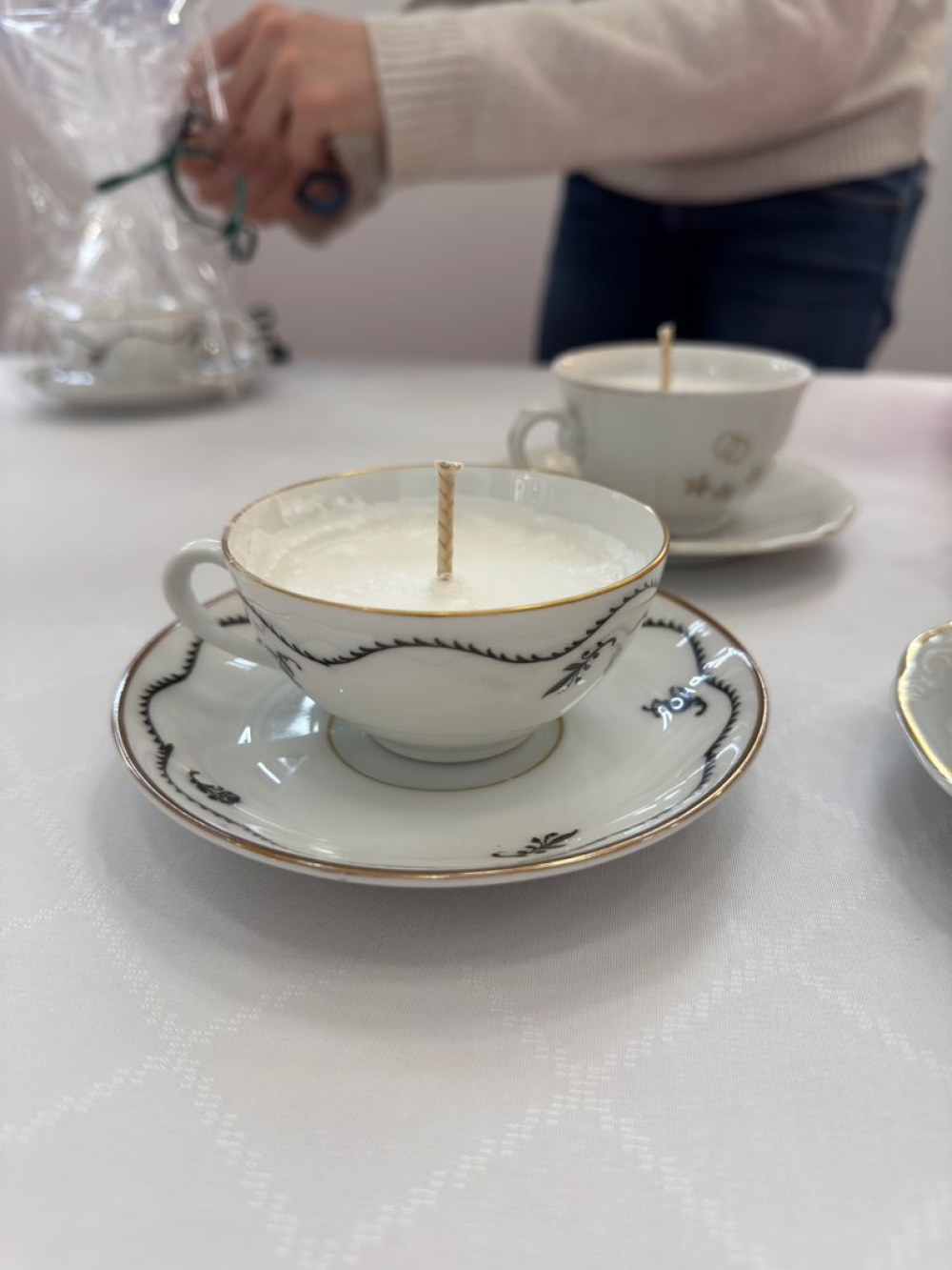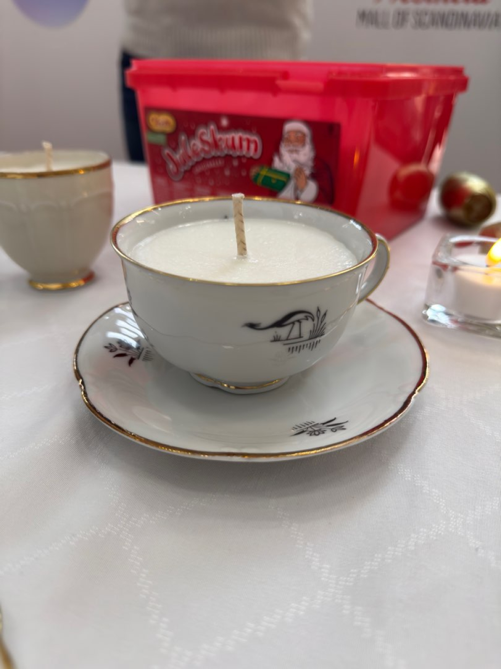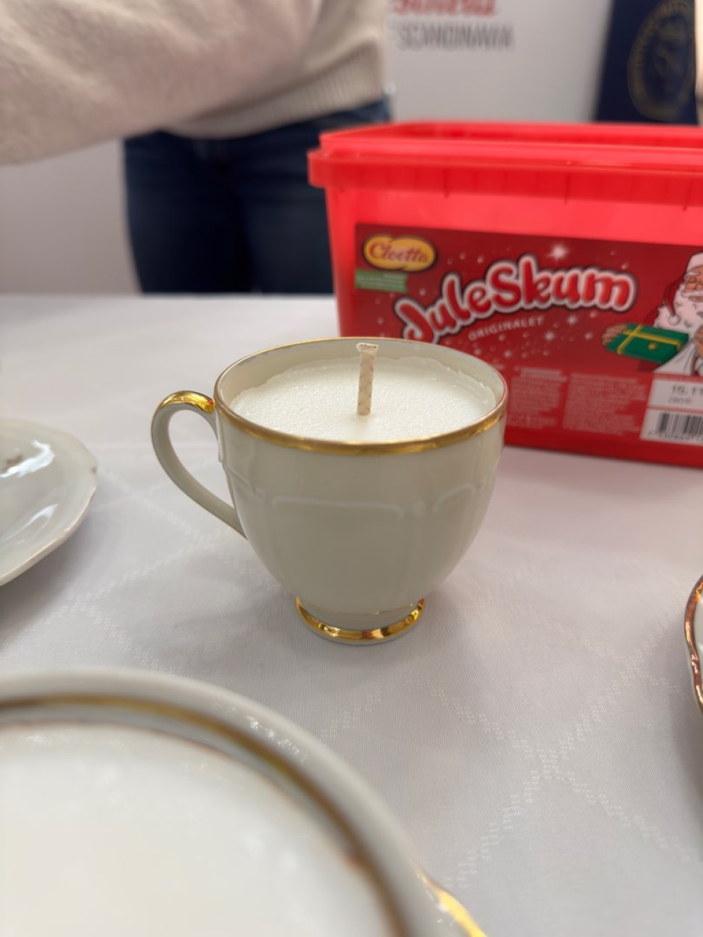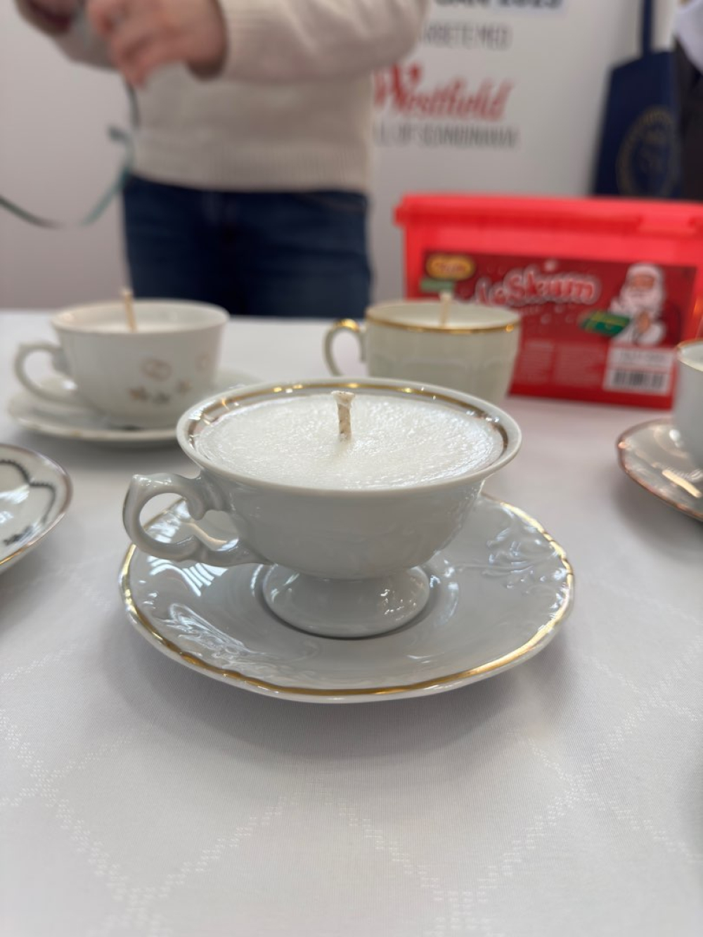 Vi tillverkar doftljus i secondhand kaffe- och tekoppar. Dofterna är inspirerade av säsongens bakverk. Doftljusen tillverkas förhand av oss och innehåller delvis återvunnet stearin.