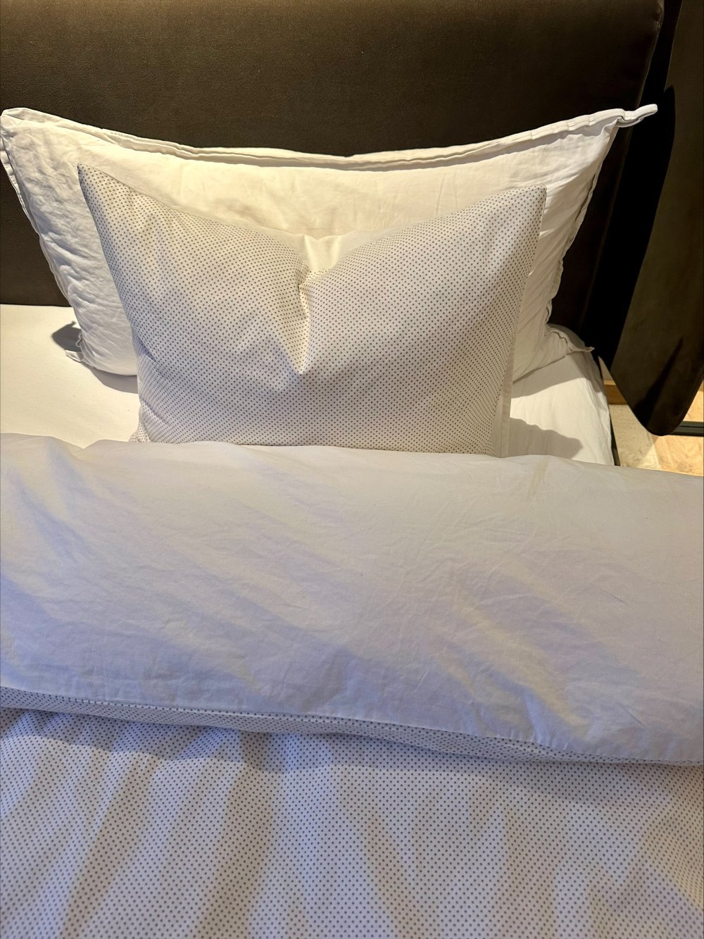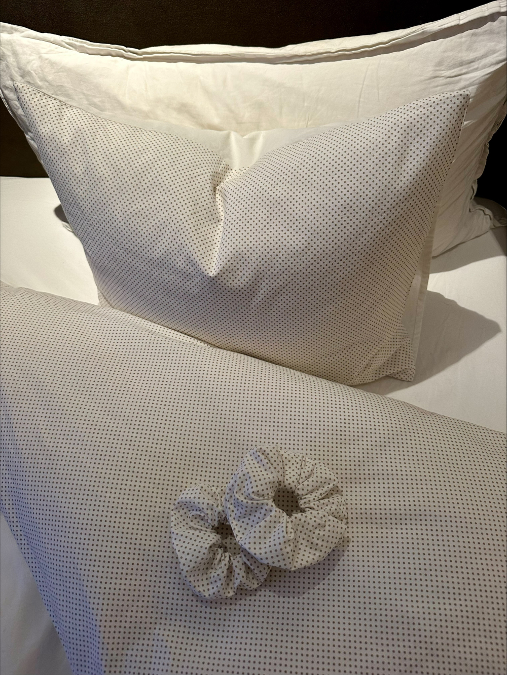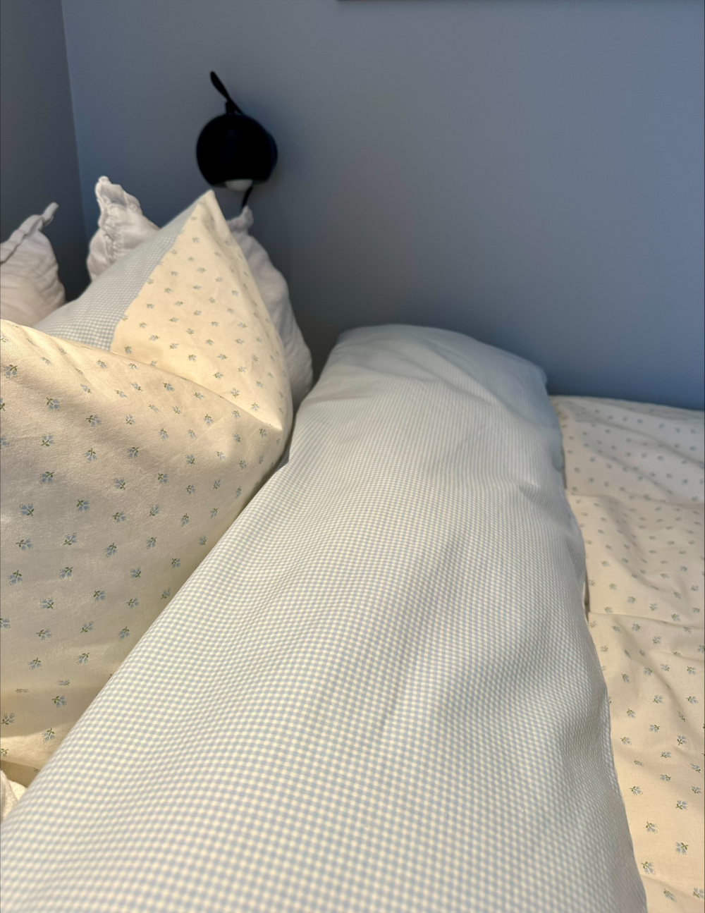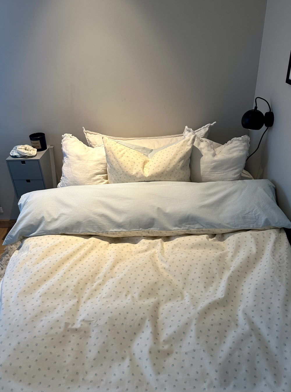 Vi erbjuder två påslakan set innehållande ett påslakan och ett örngott med två olika designs på vardera sida vilket gör det enkelt att förnya sitt rum efter tillfälle, dag och humör. Uppsättningen säljs i de mest efterfrågade måttet enligt vår marknadsundersökning: påslakan 150x210 cm och örngott 50x60 cm. Tygerna består av 100% bomull vilket är mjukt, slitstarkt och andningsbart. Vi säljer även örngott separat samt scrunchies av de överblivna tygbitarna.