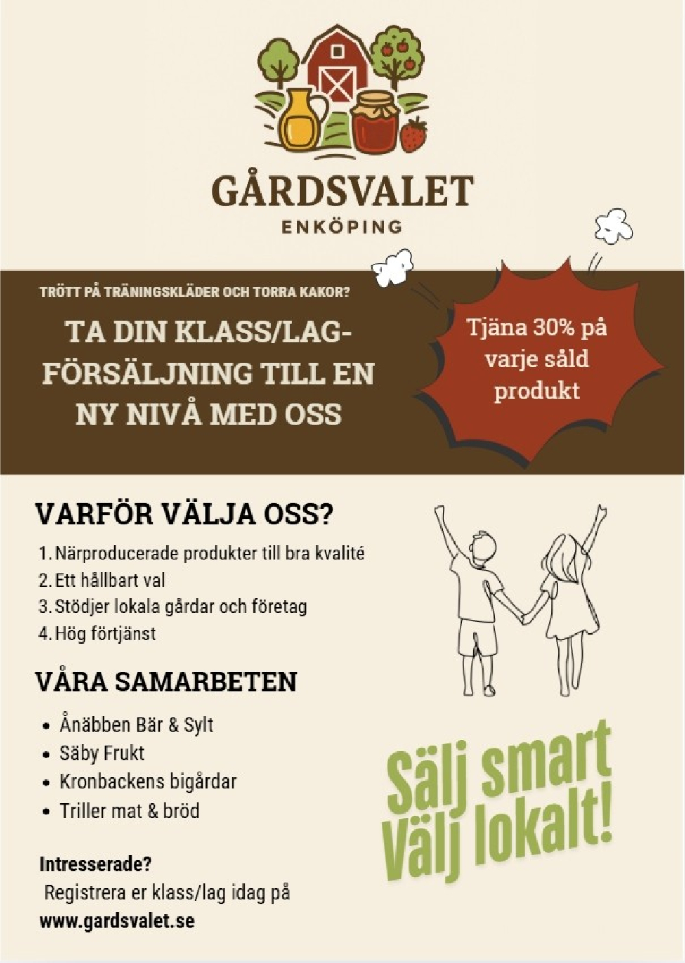 Vi är 6 drivna elever som har förändrat klassförsäljning i grunden, genom att sälja med oss bidrar man till ett mer hållbart säljande genom att stötta lokala gårdar runt om i Enköping. Dessutom erbjuder vi en smidigare försäljning genom enkel hantering av beställningar, vi levererar produkterna redan färdigsorterade som minskar mängden arbetsbelastningen som ofta faller på en enskild elev. Klasserna/lagen tjänar 30% per såld produkt vilken ger en lönsam försäljning samtidigt som de bidrar till bättre framtid.