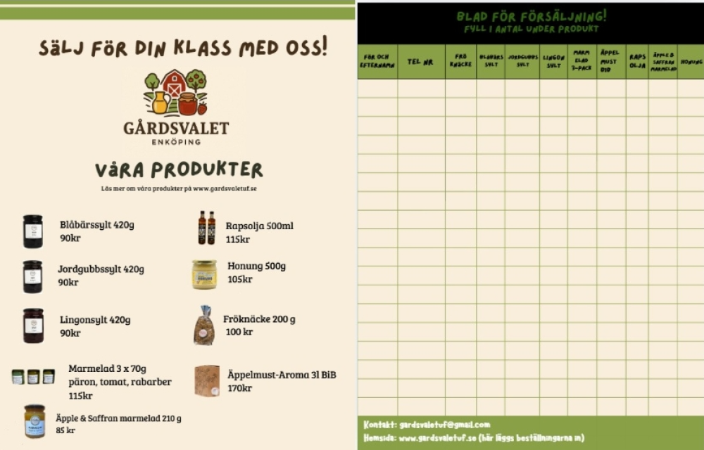 Vi erbjuder klasser/lag att sälja allt från äppelmust till marmelad där de tjänar 30% per såld produkt.