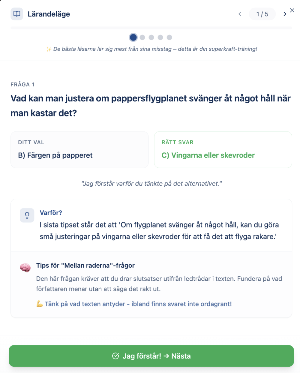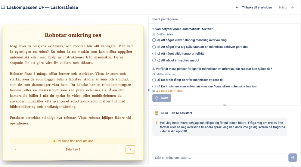 Vi säljer ett digitalt läromedel för läsförståelse med individanpassade texter och frågor, AI-baserat stöd kopplat till skolans styrdokument (LGR22) och direktåterkoppling till eleven. För lärare och föräldrar finns en administratörsvy där de kan se elevens styrkor och svagheter samt utvecklingskurva. Plattformen säljs till vårdnadshavare genom månadsprenumeration och till skolor via skollicenser per termin.
