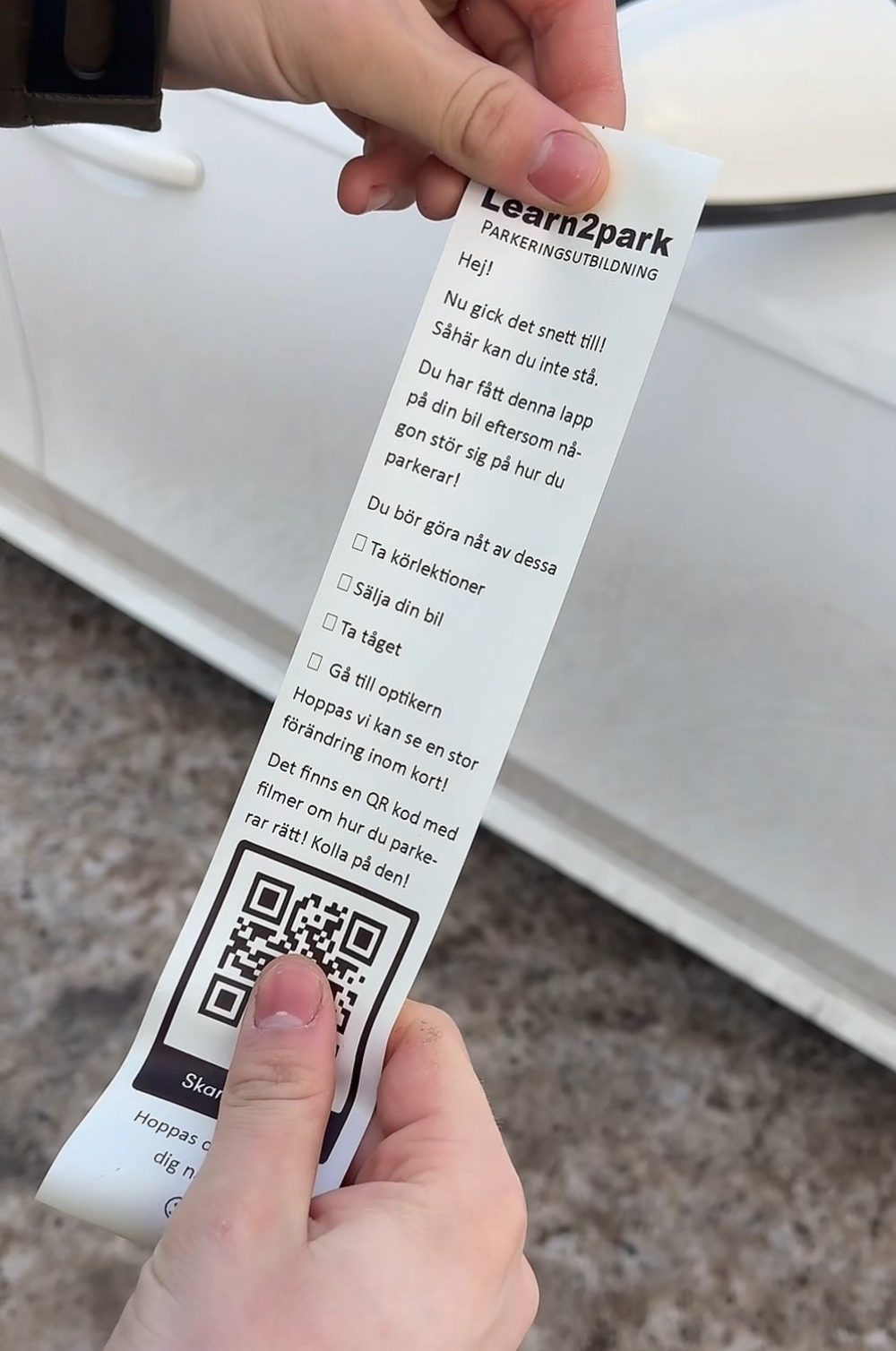 Vi säljer lappar som ser ut som parkeringsboter med humoristiska budskap som ska informera och lära folk parkera. Vi säljer till personer som ofta stör sig på andras förmåga att parkera, vi har stört oss mångtalet gånger på folks kompetens att ställa bilen rakt i rutan och nu vill vi ta fram en rolig lösning på problemet. På lapparna kommer det stå vad föraren bör göra för att lära sig parkera finnas, det kommer även finnas en QR kod som är länkade till instruktionsvideor som vi själva gör på hur man parkerar. Vi kommer trycka och skicka lapparna i Sverige till kunder i Sverige.