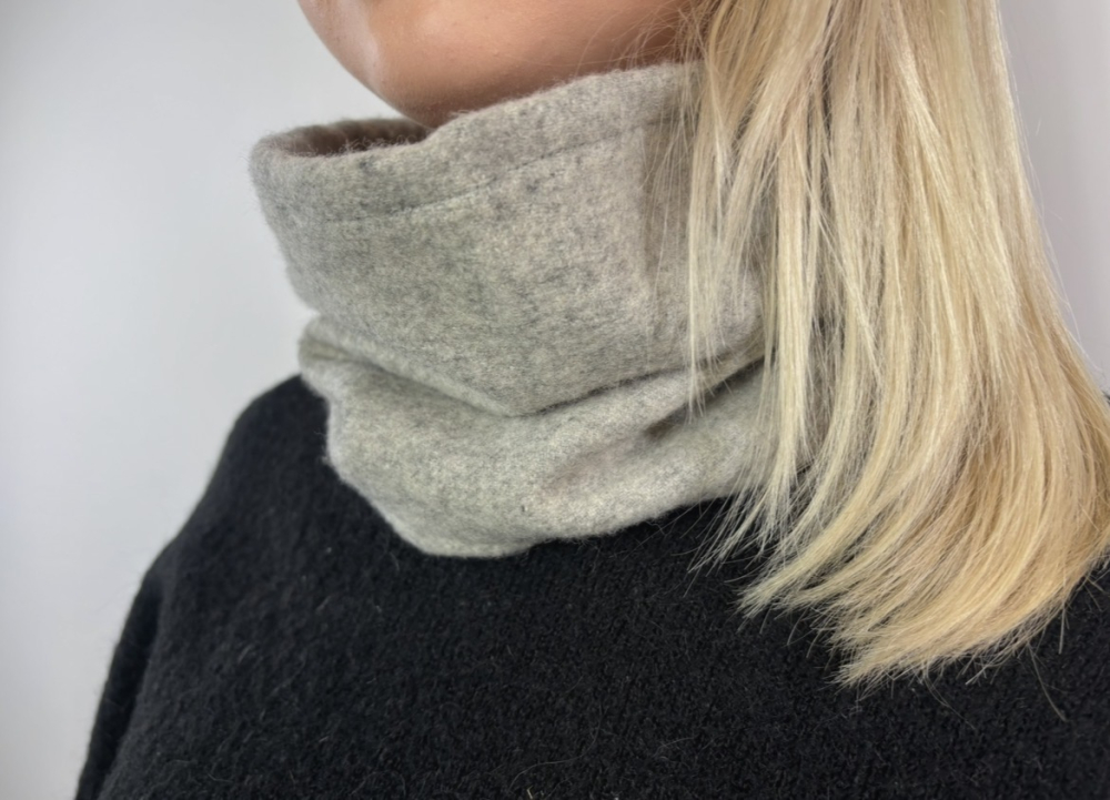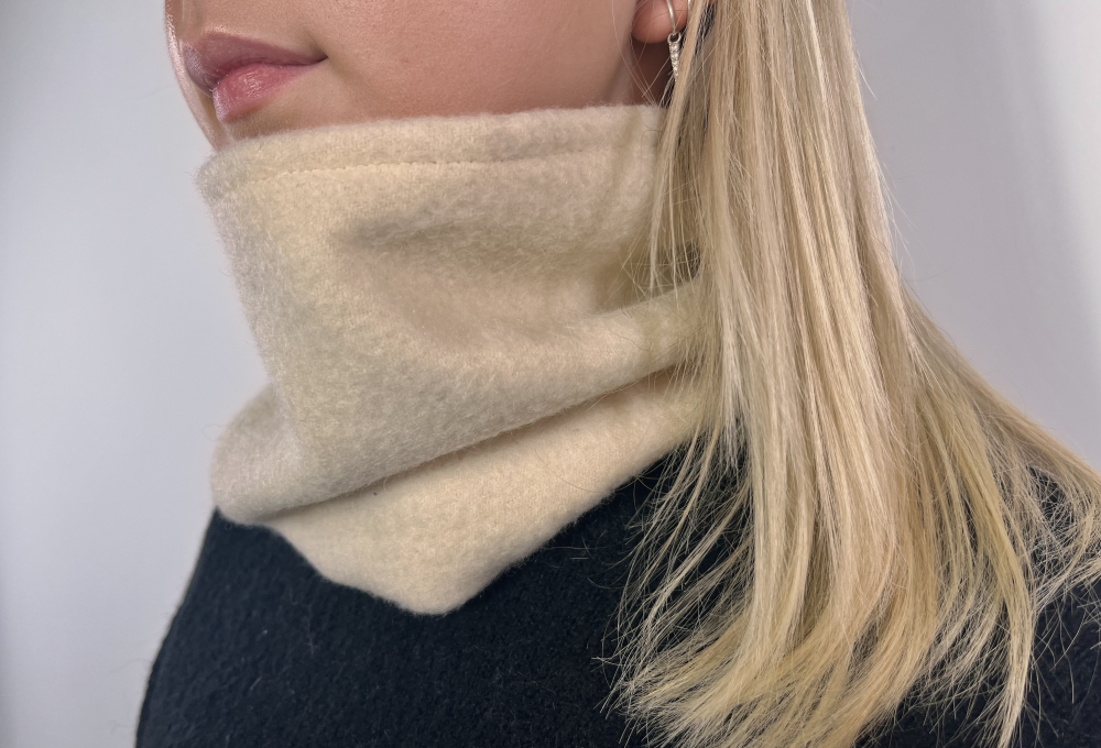 Vår produkt är en buff i 100% kashmir, där allt material kommer från secondhand-plagg. Buffen är designad för att uppfylla fler behov samtidigt, att ge värme, kännas bekvämt, och samtidigt vara ett stilrent plagg. Det finns användning av buffar i vardagen liksom för friluftsaktiviteter. Kashmir är lätt men mycket värmande, har hög andningsförmåga och reglerar kroppstemperaturen. De fina fibrerna gör materialet mjukt och med rätt skötsel är det slitstarkt och hållbart över tid.