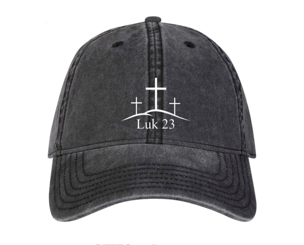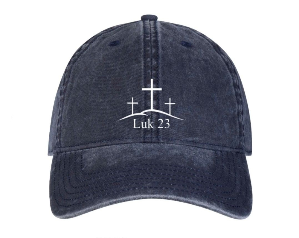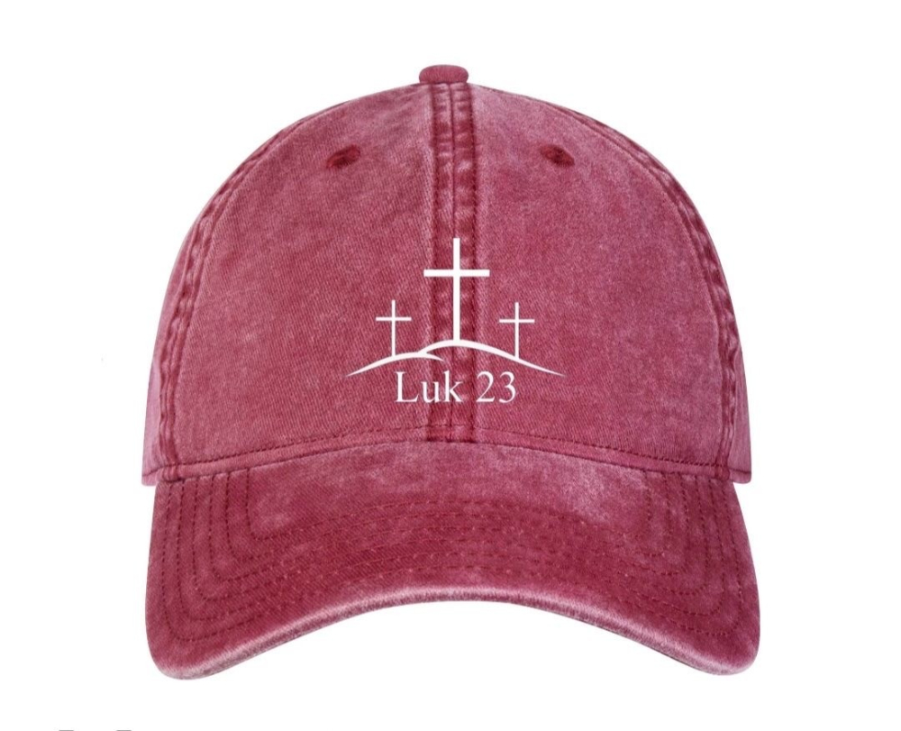 Produkten är en helt vanlig keps i aningen grövre tyg och tvättad stil med böjd skärm. På framsidan har vi valt att brodera vår design i form av ett bibelord med en gestaltande bild ovanför på tre kors. Kepsarna kommer gå att köpa i tre olika färger och dessa är rosa blandat med vinröd, marinblå och urtvättad svart.