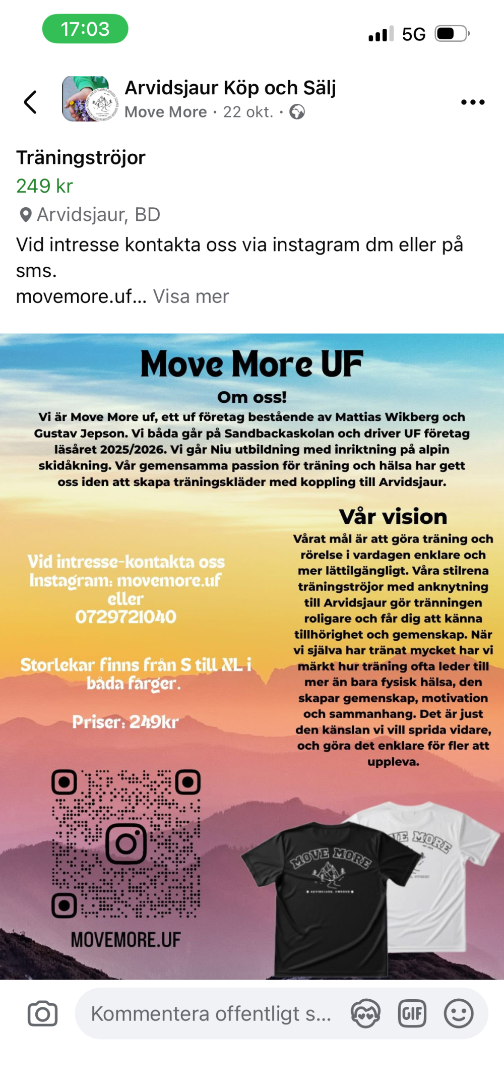 Move More UF erbjuder prisvärda och stilrena tränings-t-shirts med tryck som inspirerar till rörelse och gemenskap. Vi vänder oss främst till ungdomar och träningsintresserade i Arvidsjaur, men även till föreningar och privatpersoner som vill ha funktionella träningskläder med en personlig touch.