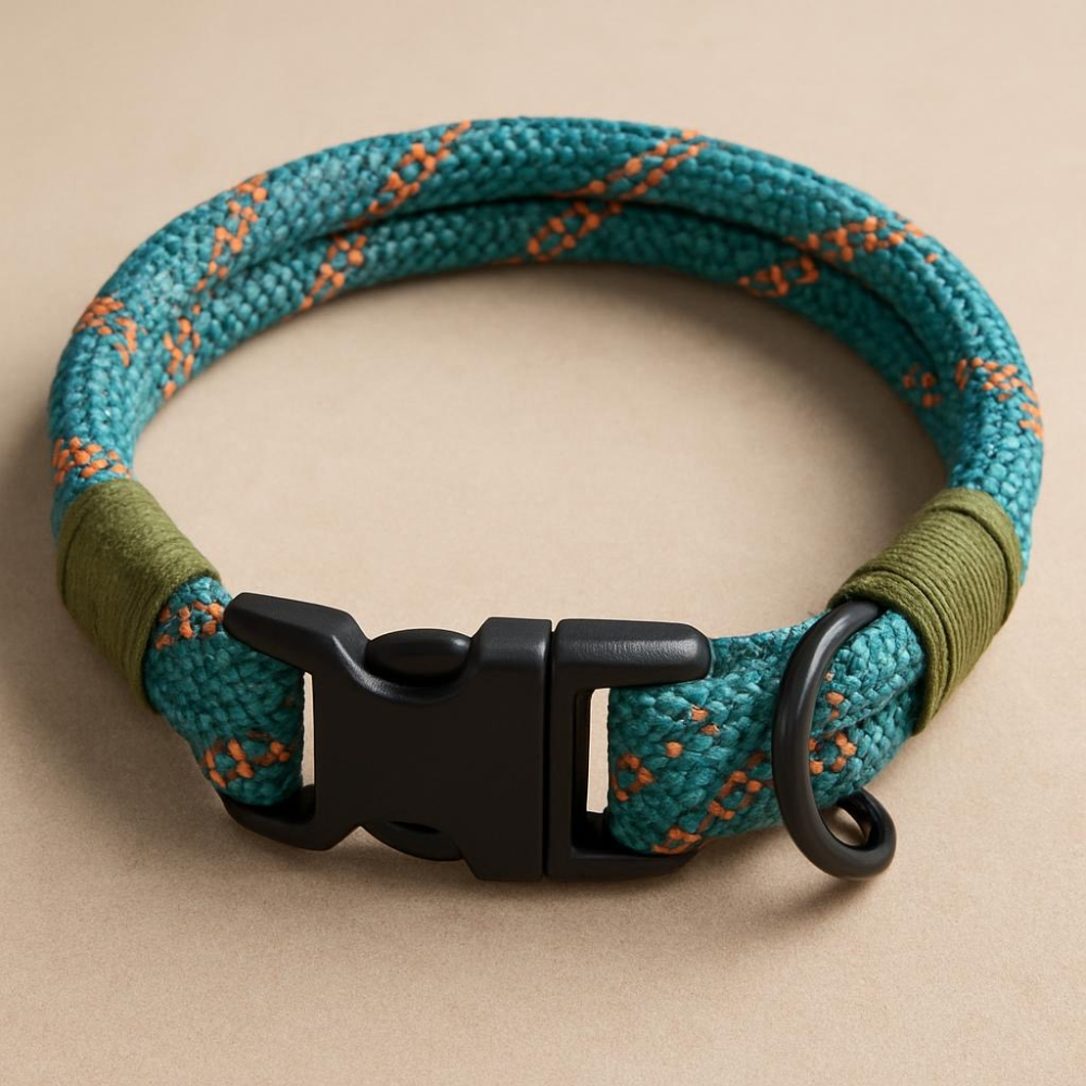 Genom att mixa återanvända klätterrep med sidenband och reflex snören kommer hunden inte bara synas i mörker och känna en bekvämlighet mot halsen, utan även bära ett stiligt halsband som är gjorda av återanvända material.