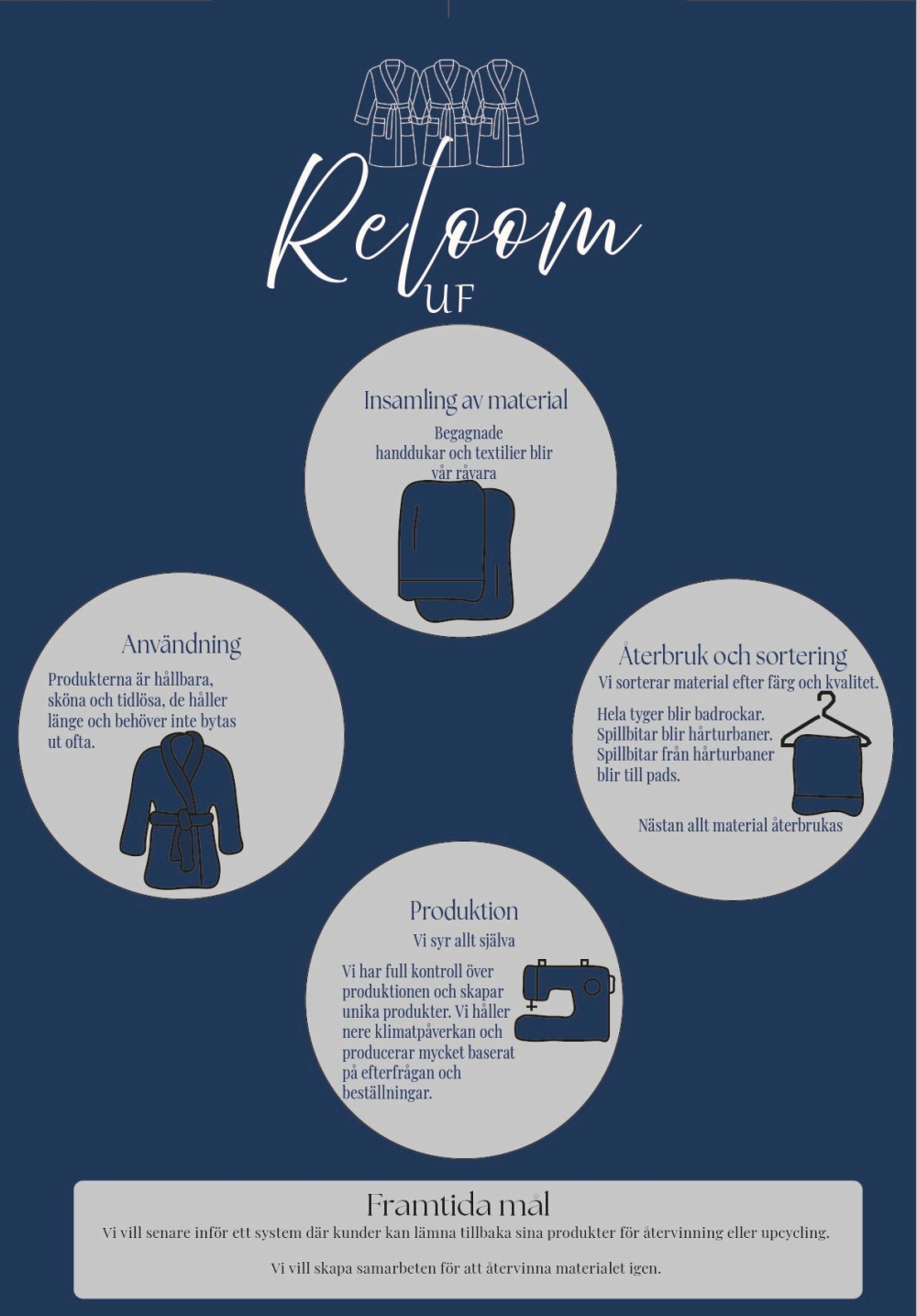 ReLoom UF:s kärnprodukt är morgonrockar och badrockar tillverkade av återbrukade frottétyger, handdukar och andra textilier från second hand. För att ta vara på spillmaterial erbjuder vi även kringprodukter i form av hårturban och ansiktspads. Våra produkter förenar hållbarhet med komfort och är designade för att ge kunderna en känsla av vardagslyx, personlig stil och medveten konsumtion.