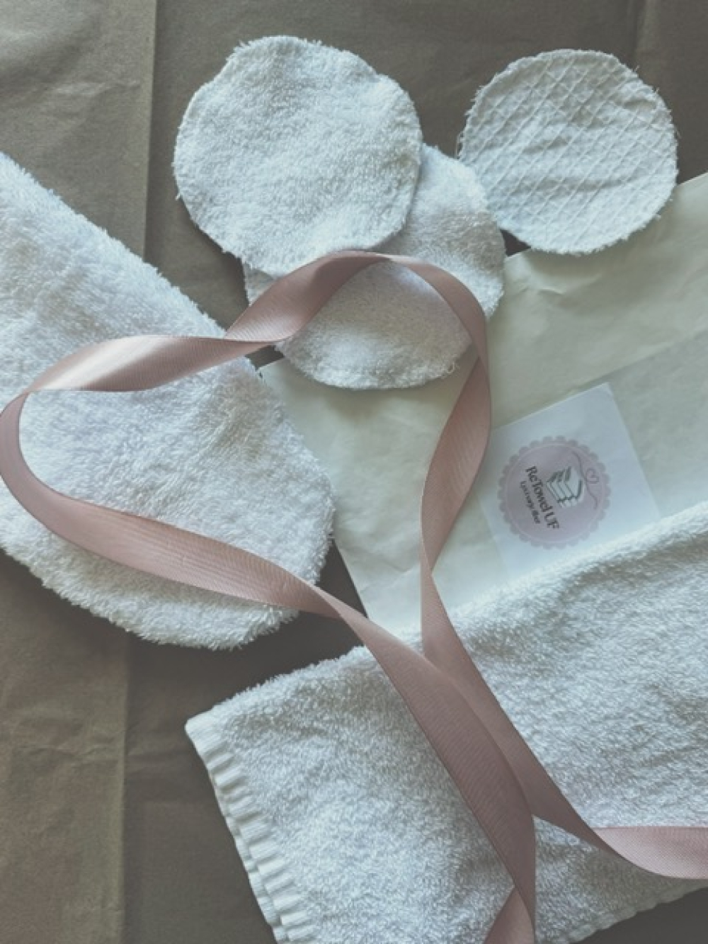 Materialet är återanvänd ekologisk frotté av hög kvalitet. Produkterna är återanvändbara och kan tvättas i tvättmaskin och användas om och om igen. Produkten är mjuk och skonsam mot huden. Med vårt företag minskar vi avfall av engångsprodukter.
