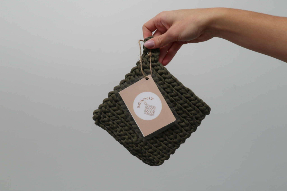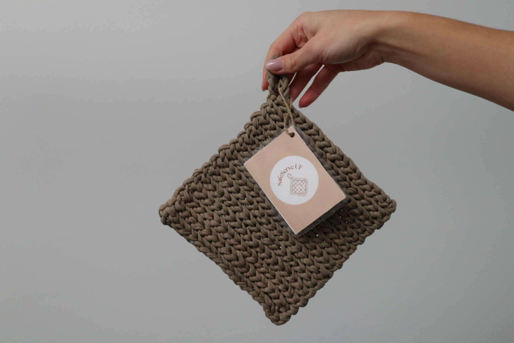 "SafeServe UF erbjuder egenvirkade grytlappar och underlägg som kombinerar både funktion och stil. Med återvunnet bomullsgarn värnar vi om säkerhet och miljö – samt ger ditt hem en unik touch."