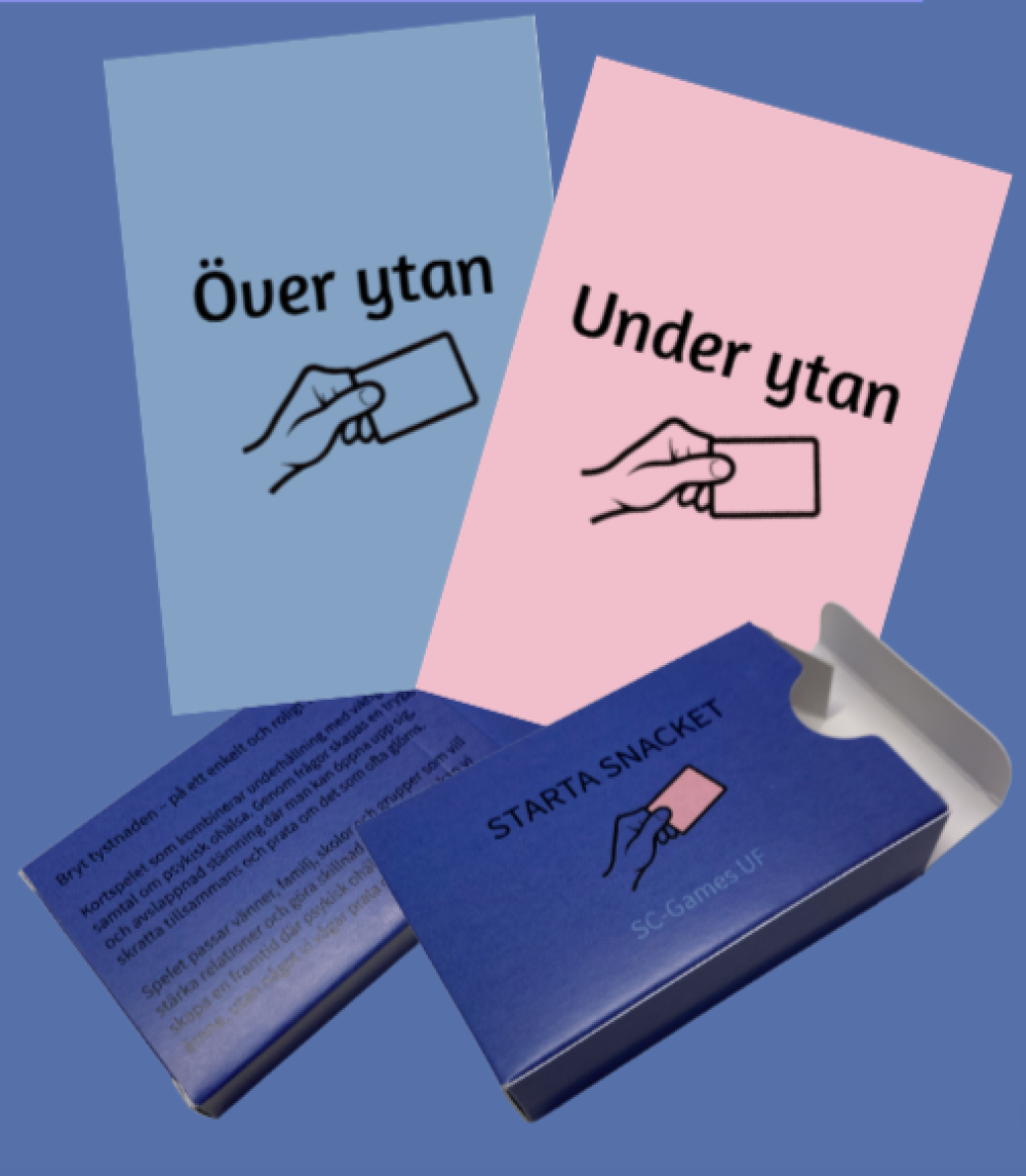 Vi har en ide av ett kortspel som berör psykisk ohälsa men som ska vara både roligt och göra det lättare för andra att öppna upp sig om jobbiga ämnen, utan att de ska känna för tungt. Spelet kommer innehålla frågor om psykisk ohälsa och frågor man inte brukar prata om. För att var och en sak reflektera över sitt mående i en trygg miljö. För att göra produktionen så ska vi använda oss av ett lokalt tryckeri för att göra de så miljövänligt det går.