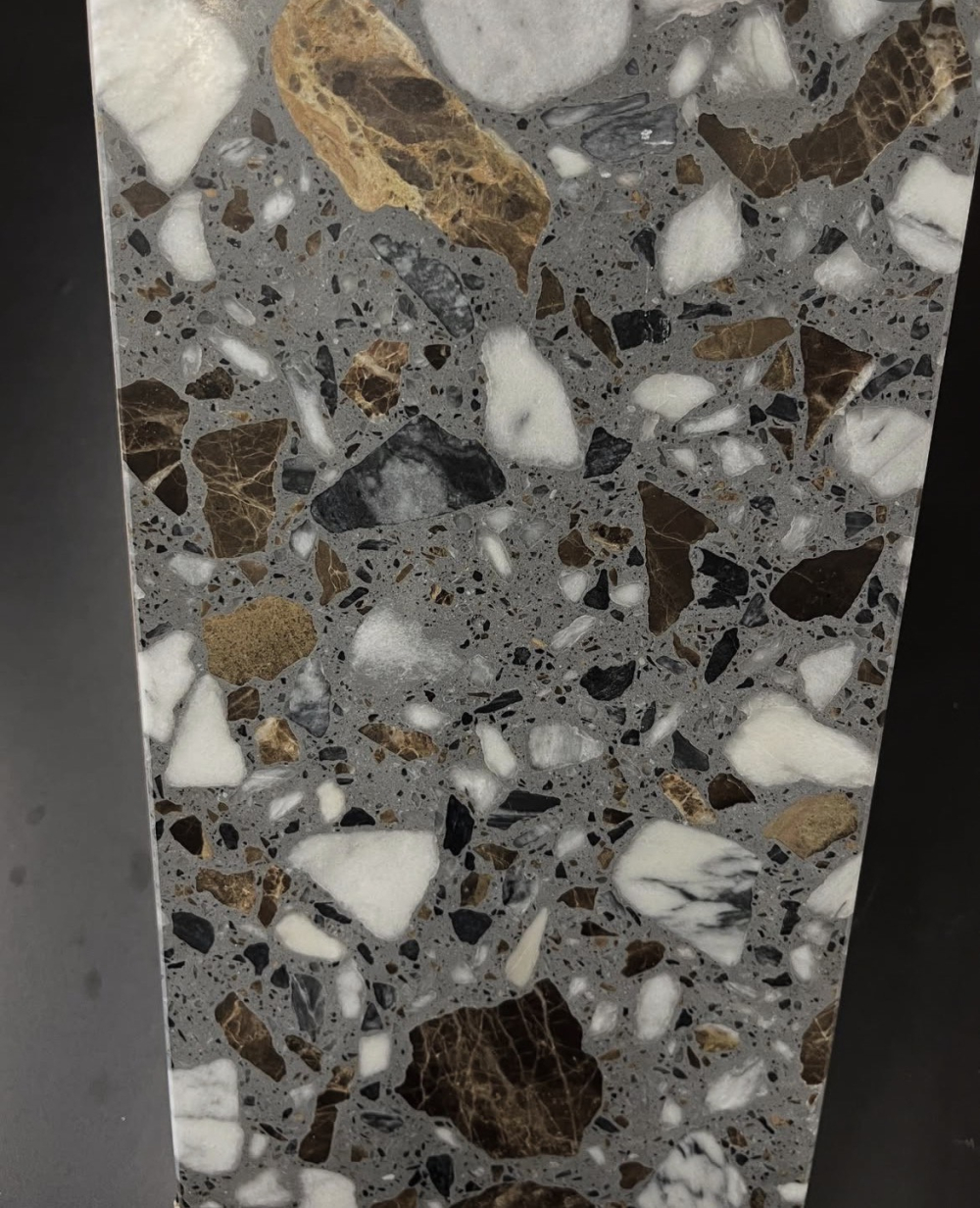 Vi gör serverings brickor i terrazzo vilket är en typ av sten matrial.