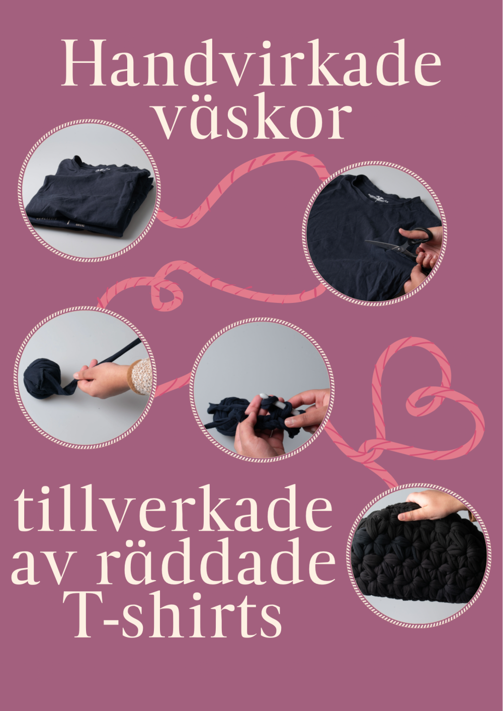 Vår affärsidé är att virka trendiga och stilfulla väskor av återvunnet material från gamla T-shirts. Varje produkt blir unik och hållbar då vi omvandlar något gammalt och "damm samlande” till något nytt och modernt. Våra väskor passar kvinnor i alla åldrar som vill främja hållbarhet samtidigt som de uttrycker sin personliga stil.
