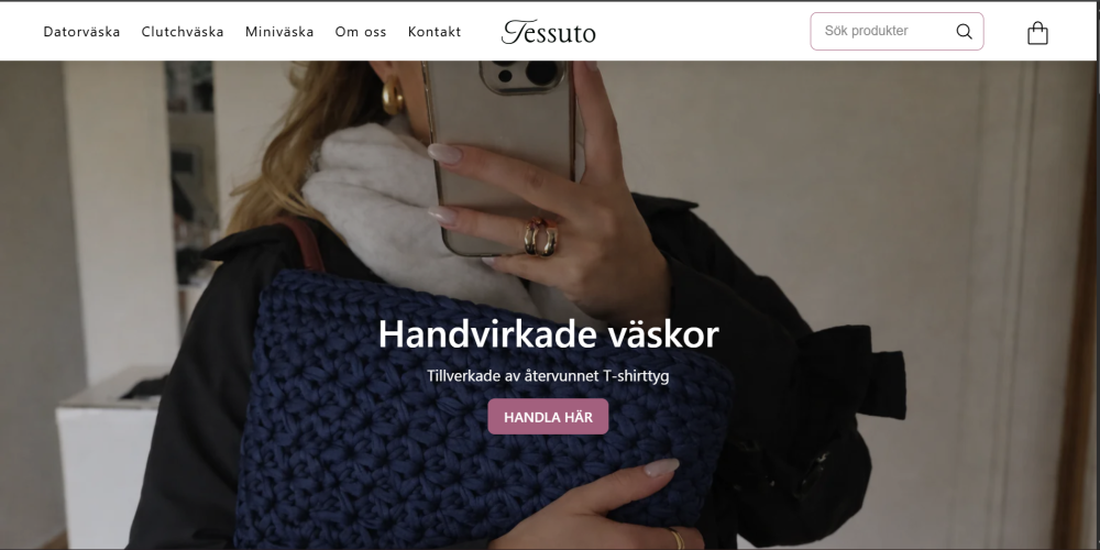 Vi på Tessuto UF skapar handvirkade, trendiga väskor gjorda av återvunna T-shirts. Genom att förvandla textilavfall till modernt hantverk erbjuder vi ett hållbart, unikt och stilrent alternativ inom mode. Varje väska tillverkas för hand, vilket gör varje exemplar helt unikt.