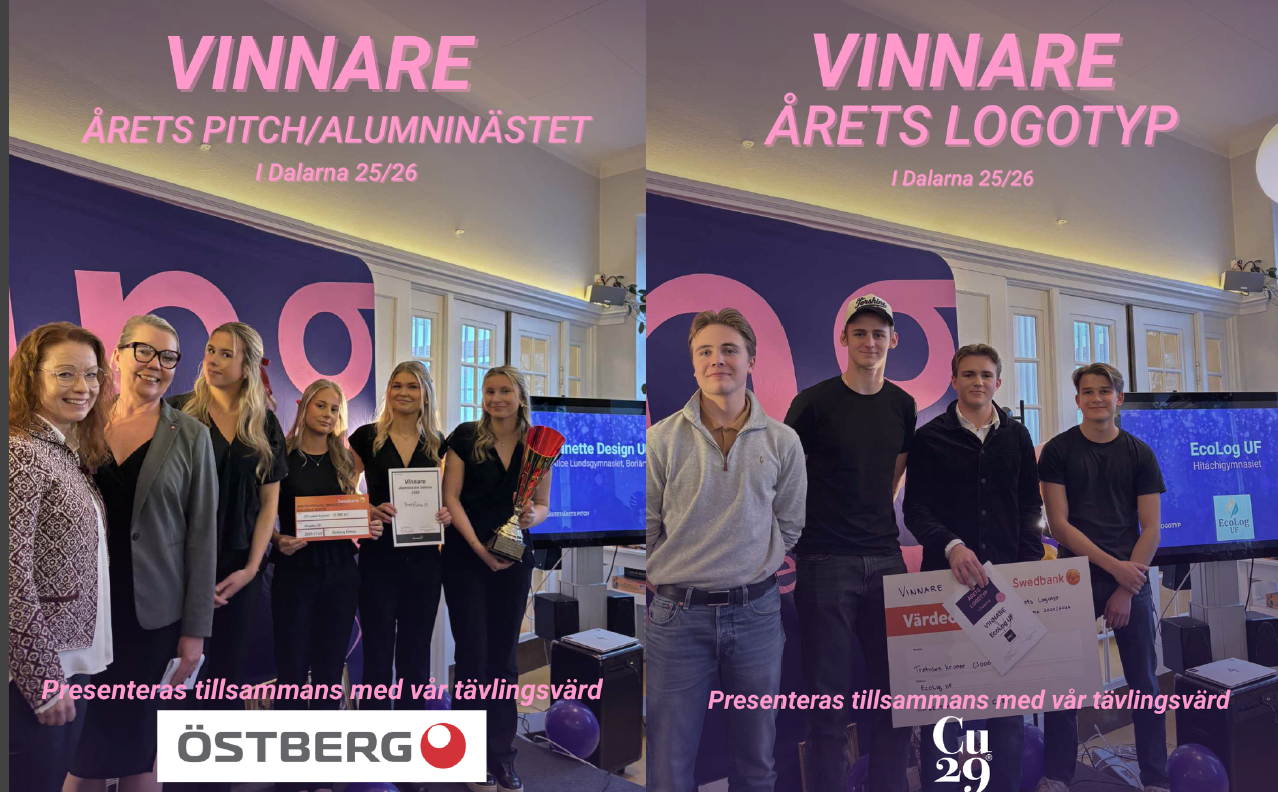 I samband med vårt 30-årsfirande delades de första priserna ut i våra regionala tävlingar läsåret 25/26. Årets första vinnare är EcoLog UF, Hitachigymnasiet Ludvika som vann Årets logotyp och Vinette Design UF, Alice Lundsgymnasiet Borlänge som tog hem segern i Årets pitch/Alumninästet.