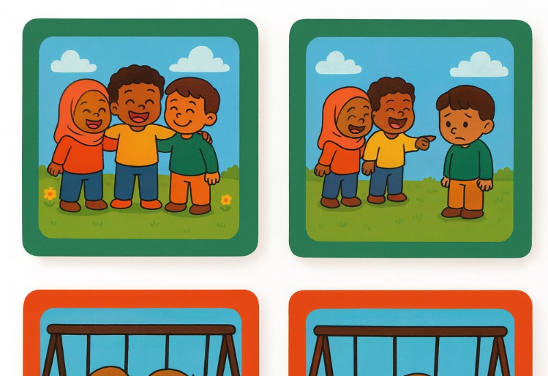 Vi erbjuder ett memory-spel med syftet att motverka mobbning och den psykiska ohälsan. Spelet består av 12 par med bilder som redovisar knepiga situationer, samt lösningar på problemen som uppstått. Spelet "Vänskapsjakten" är anpassat till barn i åldern 2-8 år och spelas i utbildningssyfte genom ett främjande av barns värdegrund. I spelets förpackning medföljer spelregler och pedagogiska hjälpmedel i form av frågeställningar för att underlätta samtalen och förståelsen.