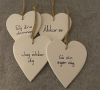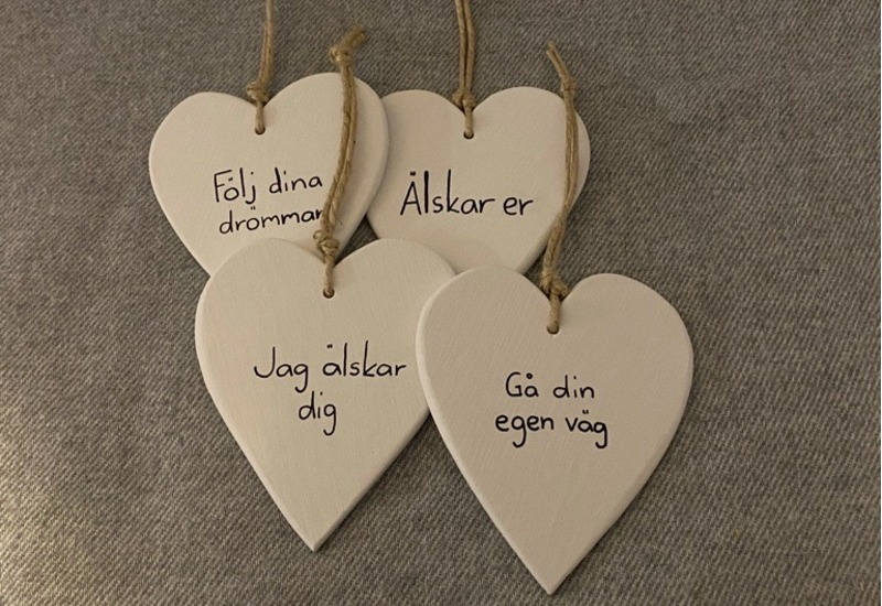 Hängande hjärtan med budskap. Det finns färdiga budskap och man kan välja själv vad för text det ska stå på. 12cm x 14cm, tjockleken kan variera eftersom jag använder spillmaterial.