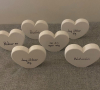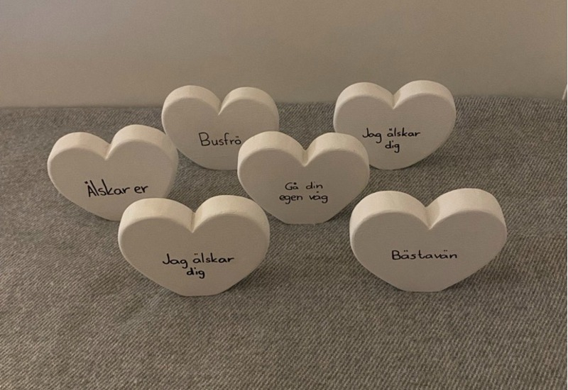 Stående hjärtan med budskap. Det finns färdiga budskap och man kan välja själv vad för text det ska stå på. 10cm x 8cm.