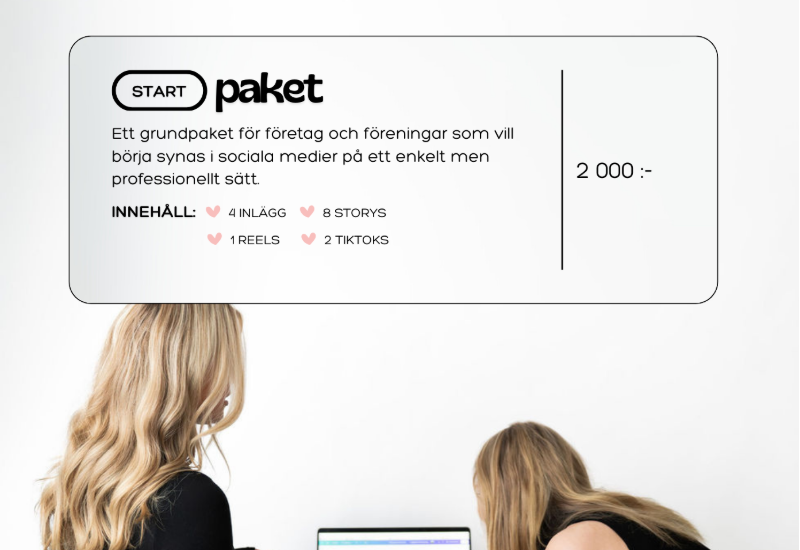 Vi har utvecklat tre paketlösningar för att möta olika behov och budgetar. På så sätt kan både små och större företag hitta en lösning som passar just deras verksamhet. Start paketet är ett grundpaket för företag och föreningar som vill börja synas i sociala medier på ett enkelt men professionellt sätt.