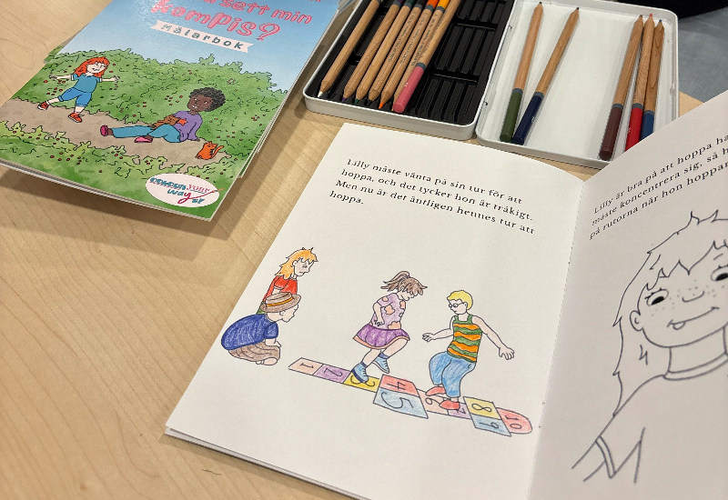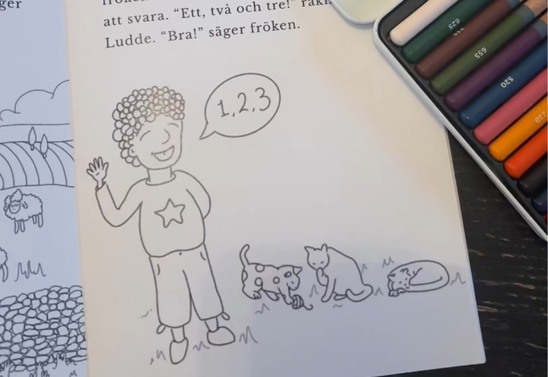 Vi säljer en barnmålarbok som riktar sig till barn i åldrarna fem till sex år. Boken kombinerar en enkel berättelse med färgläggningsbilder och handlar om Lilly och Ludde som besöker en bondgård och lär sig räkna djur. Genom handlingen förmedlas viktiga budskap som att våga be om hjälp, att problem går att lösa och vardagliga principer som turordning och säkerhet. Målarboken tränar även finmotorik och stödjer barns skrivutveckling.