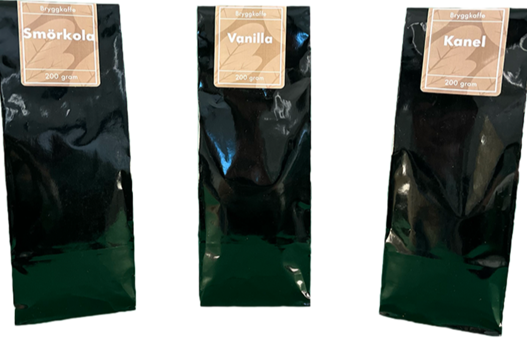 Vi säljer smaksatt kaffe. De olika smakerna är i nuläget vanilj, smörkola och kanel, kardemumma. Dessa smaker kommer att säljas i 200 grams paket. Det kommer vara färdigt bryggkaffe.