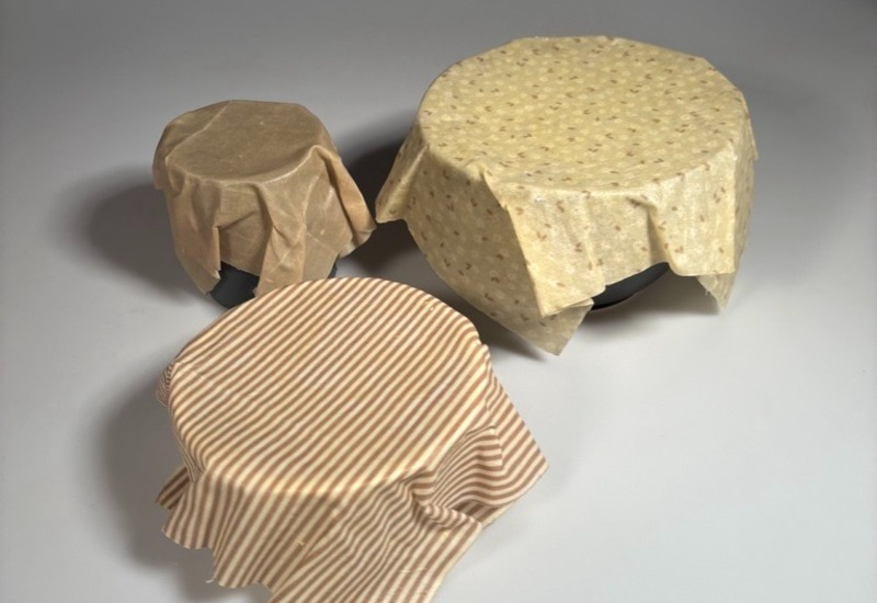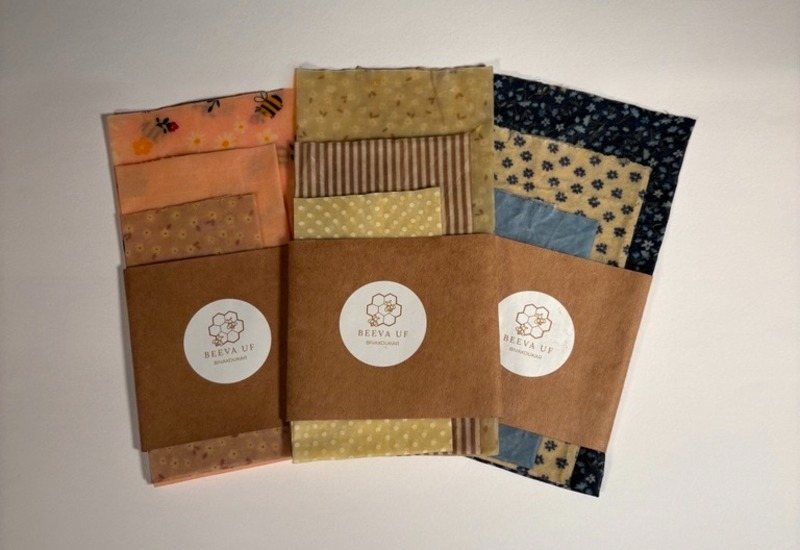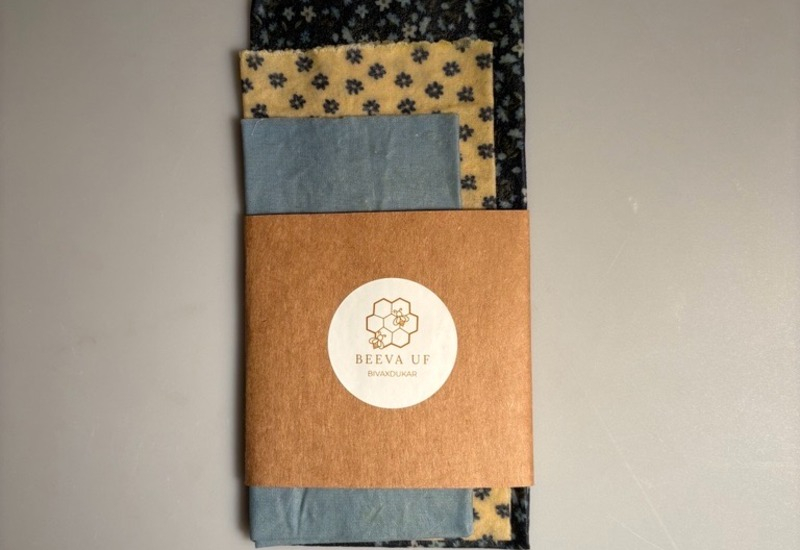 Beeva UF säljer handgjorda, återanvändbara bivaxdukar – ett naturligt alternativ till plastfolie. Ett set innehåller tre storlekar (20×20, 25×25 och 30×30 cm) som formas av handvärme och passar för frukt, grönsaker, bröd, ost och att täcka skålar. Tillverkade av ekologisk bomull, bivax, kolofonium och jojobaolja. Skölj i kallt vatten och lufttorka. Undvik värme samt rått kött/fisk.