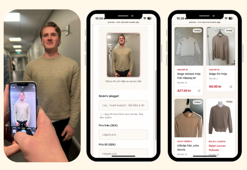 Vår produkt är en tjänst som underlättar secondhandshopping och lanseras som en app i januari. Huvudfunktionen är att använda bildsökning för att hitta plagg som liknar det man vill ha. Man kan antingen ta en bild direkt i appen eller ladda upp ett foto från kamerarullen och sedan avläser en AI bilden och letar efter plagg som liknar det på bilden på olika secondhand-plattformar.