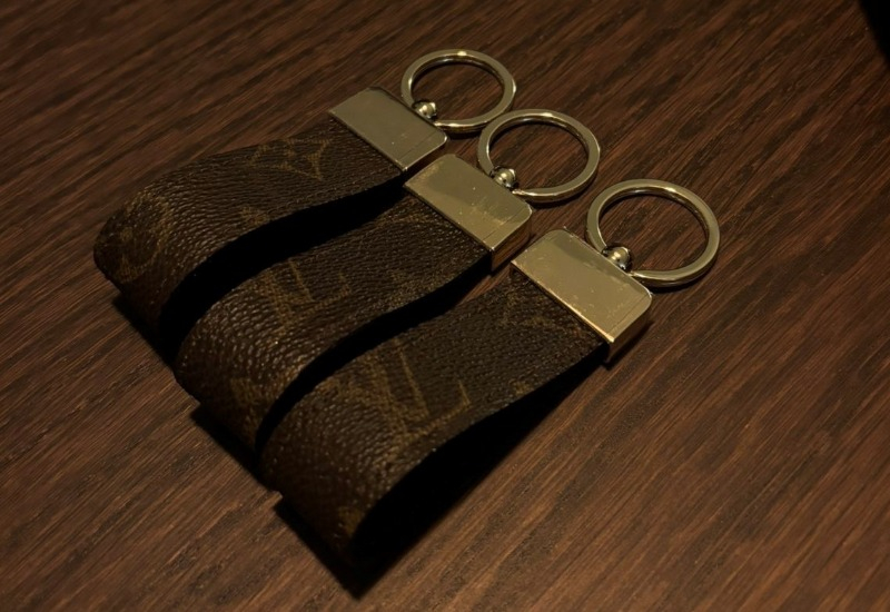 Handgjorda nyckelringar med gulddetalj av återvunnet material, från äkta vintage väskor.