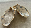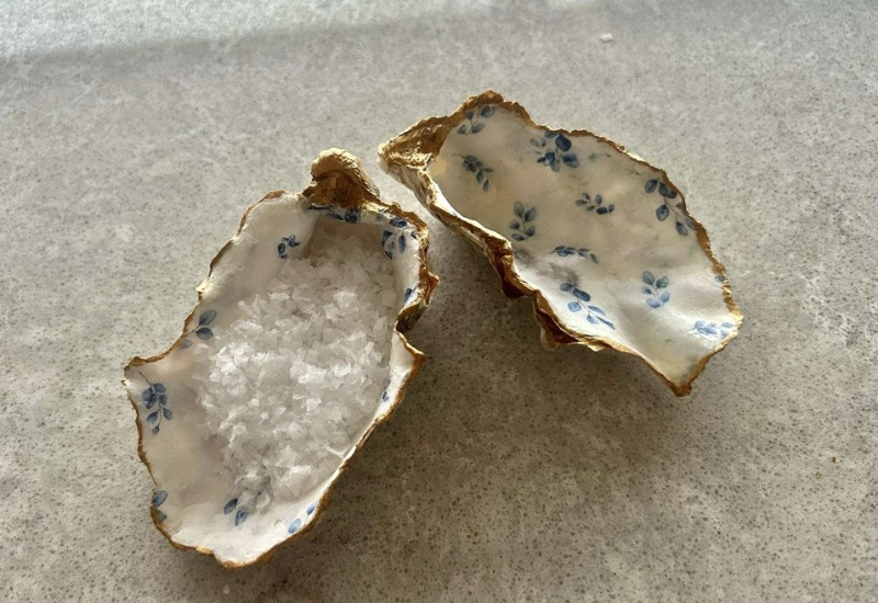 Vi säljer återanvända ostronskal som vi omvandlat till inredningsdetaljer. De kan användas som serveringsskål för oliver eller snacks, men också som en stilfull detalj i ditt hem.