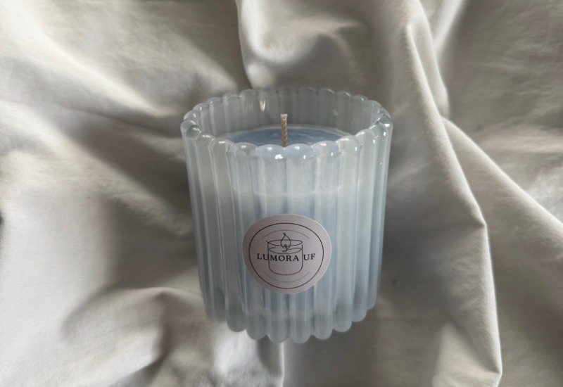 Doftljus med doft av nytvättade lakan i en härlig ljusblå färg.