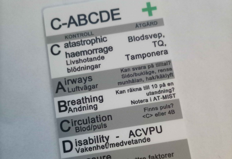 Det finns mycket saker att hålla koll på vid olyckor, därför har vi gjort ett kort med CABCDE instruktioner som enkelt går att sanera, och är väldigt tåligt. Kortet är lika stort som ditt bankkort eller körkort, så går enkelt ner i plånboken!