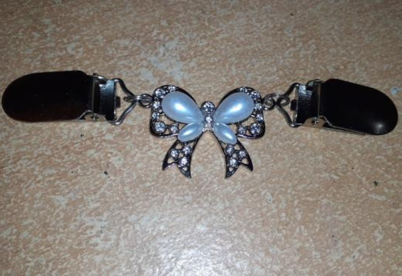 Dekorativ waist clip med rosett i silverfärg och vita stenar. Används för att dra in tröjor, toppar eller klänningar och ge en snygg passform. Enkel att fästa och både praktisk och stilren.