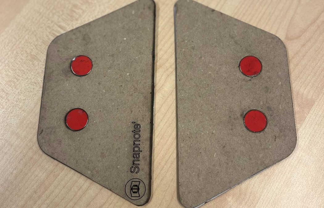 Vår produkt är en enkel och smart lösning för dig som vill hålla ditt anteckningsblock stängt och dina anteckningar i fint skick. Den består av två självhäftande plattor som du enkelt fäster på blocket. Med hjälp av magneter hålls blocket stängt, så att sidorna inte viks eller skadas i väskan. Produkten är diskret, lätt att använda och tillverkad av hållbara material för att fungera i vardagen.