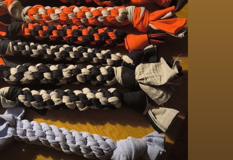 En hundleksak du både kan aktivera din hund med eller bara låta den ha kul och leka med. Hundleksakerna är använd av kläder och annat som annars skulle slängas.
