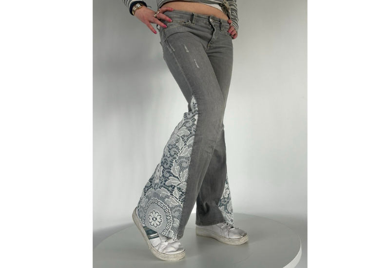 Här är våra "Old School Lace" jeans i storlek XS. Måtten är 33 cm rakt över midjan och 70 cm i innerbenslängd. Bra skick.