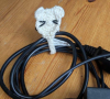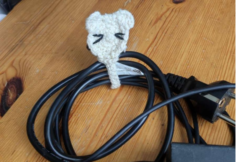 Här har vi kattformade huvuden med långa svansar. Svansarna har formen av en uggla som katthuvudet får plats igenom. Katten fungerar som en säkerhetsknut som går att sätta på trassliga sladdar för att hålla dem i ordning.