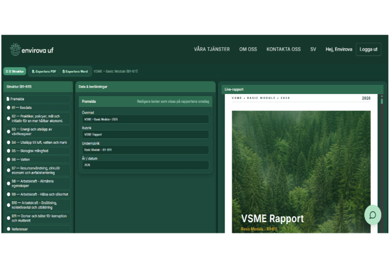 Genom ett webbaserat, lättanvänt verktyg ger vi företag möjligheten att snabbt få koll på sin klimatpåverkan och börja arbeta strukturerat med hållbarhetsfrågor, utan att behöva vara experter. Med VSME-standarden som grund erbjuder vi en plattform där företag kan mäta, visualisera och följa upp sina utsläpp, och samtidigt skapa ett professionellt underlag för hållbarhetsrapportering. Vi sänker tröskeln för att komma igång, både ekonomiskt och praktiskt.