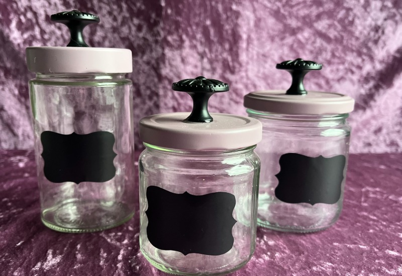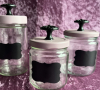 Tre glasburkar i olika storlekar med lila lock, svart knopp med texturerat mönster och en skrivbar etikett på sidan