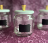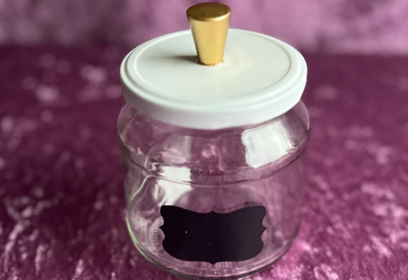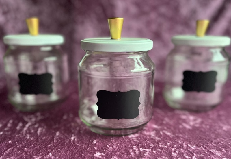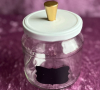 Glasburkar med vita lock, guld knopp, svart skrivbar etikett.