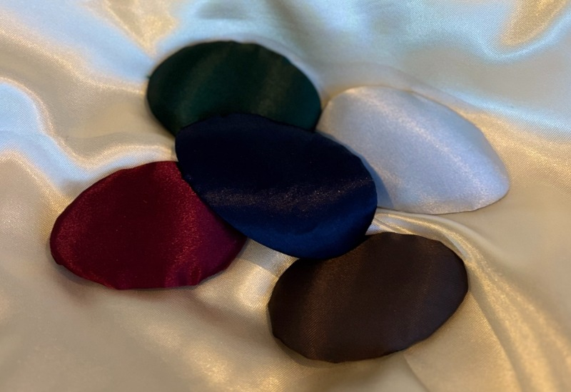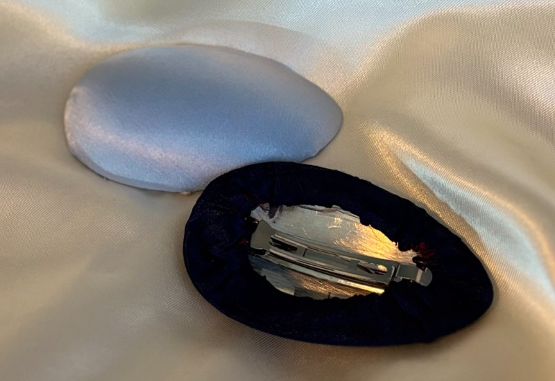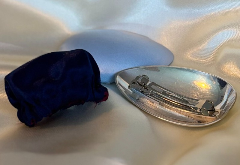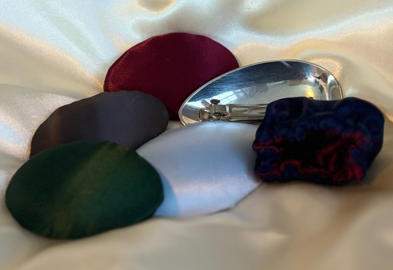 Hårklämma av sked med avtagbart satinöverdrag. Kan även bäras utan satinöverdrag. Vi har ett brett utbud av färger på satintyget. Produkten är handgjord och hållbar för miljön då materialet är återbrukat.