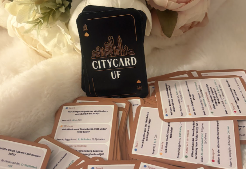 CityCard UF erbjuder ett unikt och lärorikt kortspel om Kronoberg, skapat för familjer, vänner och grupper som vill umgås på ett roligt och meningsfullt sätt. Vår produkt består av 45 spelkort varav ett av spelkorten är spelinstruktioner och innehåller 176 frågor med 4 olika kategorier. Genom spelet får spelarna upptäcka länets sevärdheter, geografi och kultur samtidigt som gemenskapen stärks. Spelet finns i olika kategorier för att anpassning av alla åldrar. Perfekt för att skapa gemenskap.