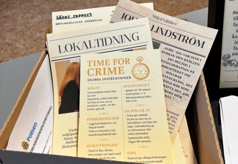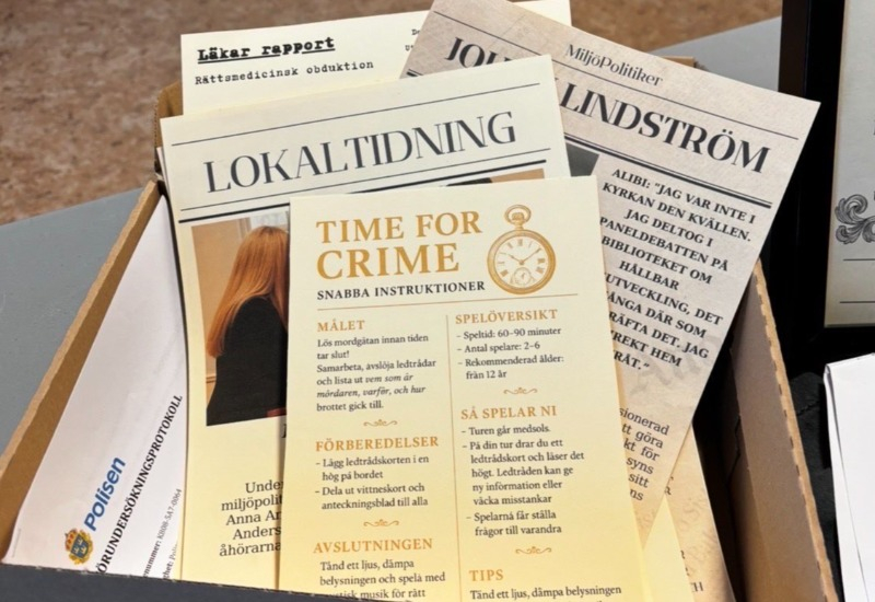 Time for Crime UF säljer ett familjevänligt mordmysteriumspel där spelare tillsammans löser ett fiktivt fall genom ledtrådar och diskussion. Spelet utspelar sig i Växjö och skapar gemenskap genom samarbete och samtal utan skärmar. Det är anpassat från 12 år och uppåt och passar familjer och vänner som vill umgås på ett roligt och engagerande sätt.